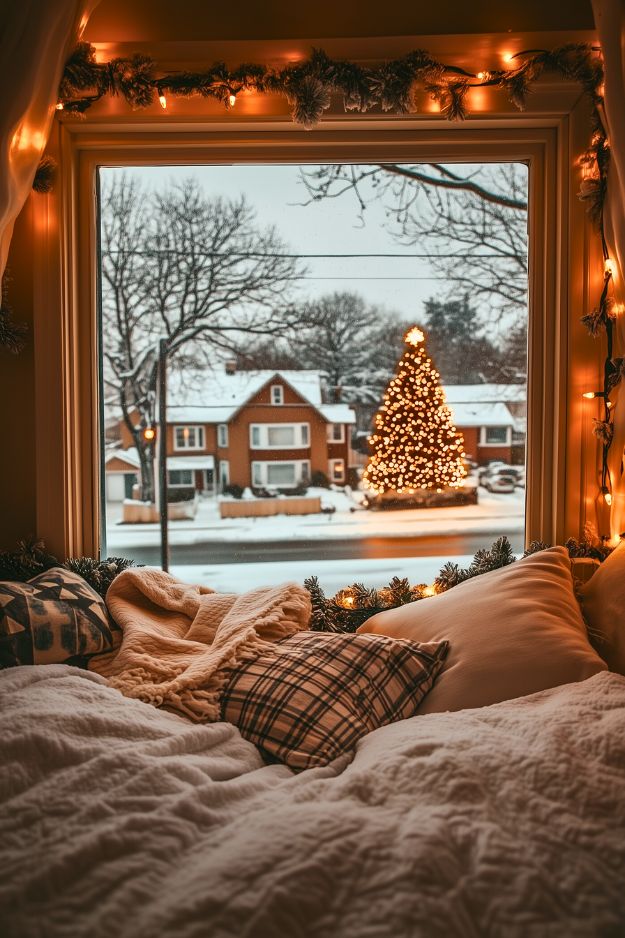 If your window sill isn’t big enough for a full Christmas village, you can still get that cozy holiday vibe with just some string lights and a simple garland. Looking at this setup, I can’t help but think it’s the kind of look that makes your bedroom feel like the perfect little hibernation spot for the season.