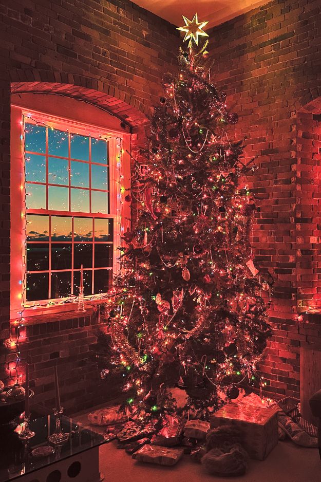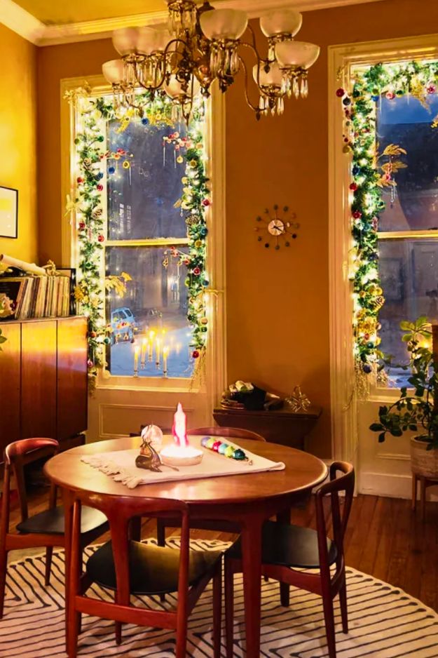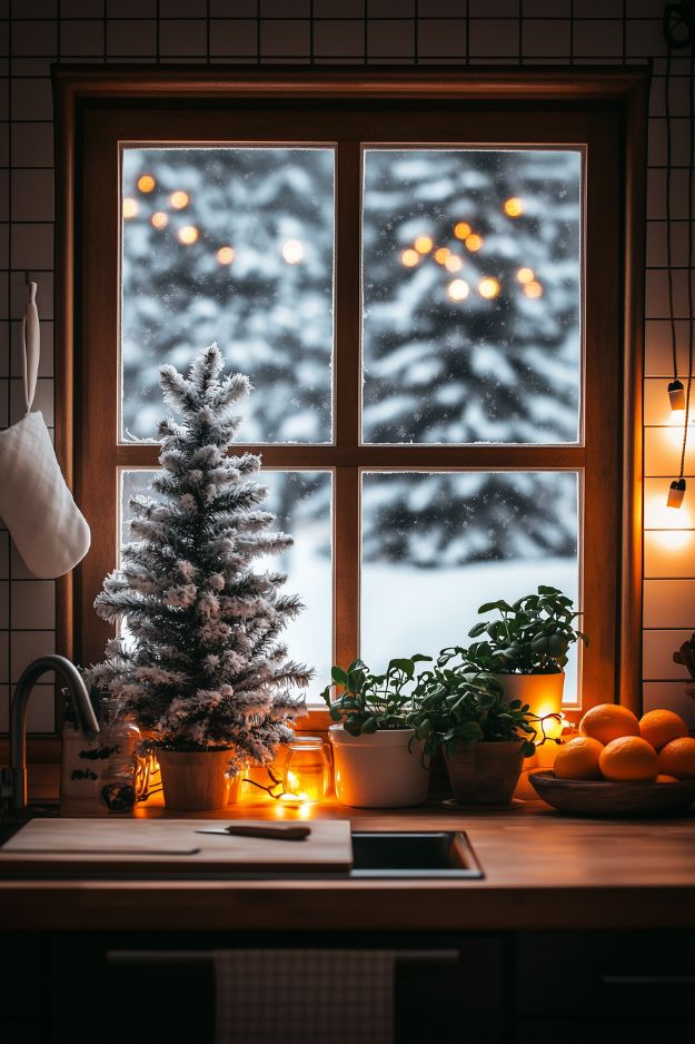 This one’s more of an illustration, but it’s exactly how I picture a rustic kitchen window for Christmas, soft string lights setting the mood. Warm lights are the way to go here, white lights might make it feel icy, and I’m leaning more toward cozy than cold.