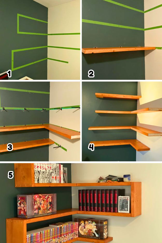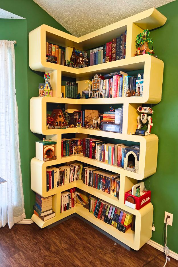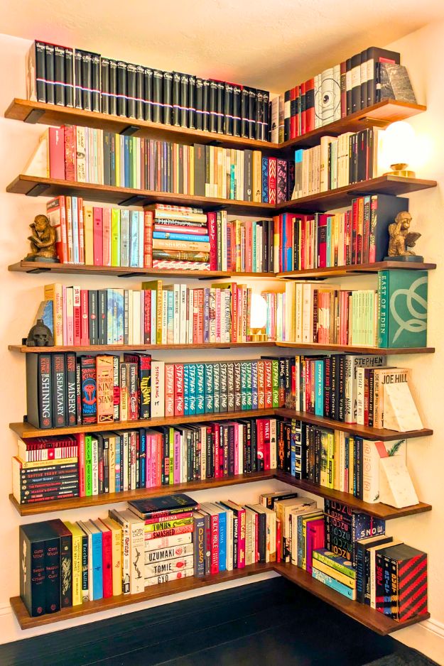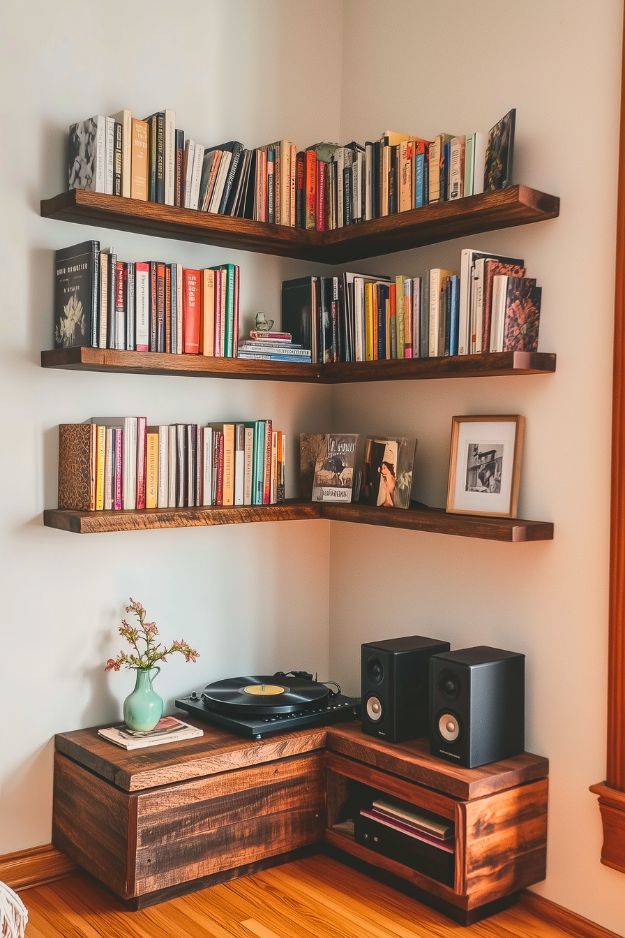 Corner shelves like these are honestly such a cheat code for making a room feel more “designed” without taking up floor space. I love how the floating L-shaped shelves turn a plain corner into a warm little library wall, and the mix of upright books + a few face-out displays makes it feel curated instead of crammed.