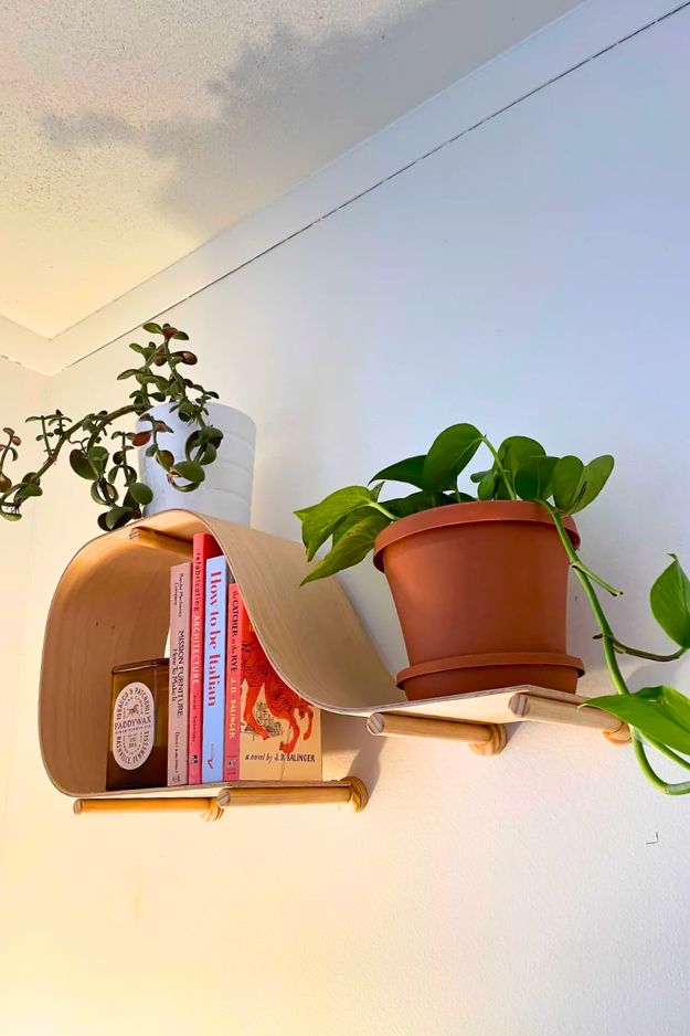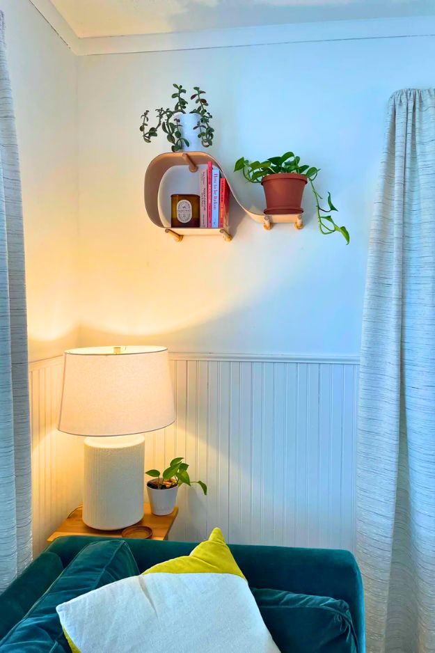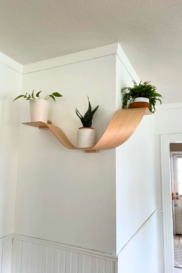 I can’t get over how these shelves look like they’re mid-movement, like a strip of wood got caught in a breeze and decided to live on your wall permanently. The corner wrap is the knockout, it turns a boring 90-degree angle into a feature instead of a problem.