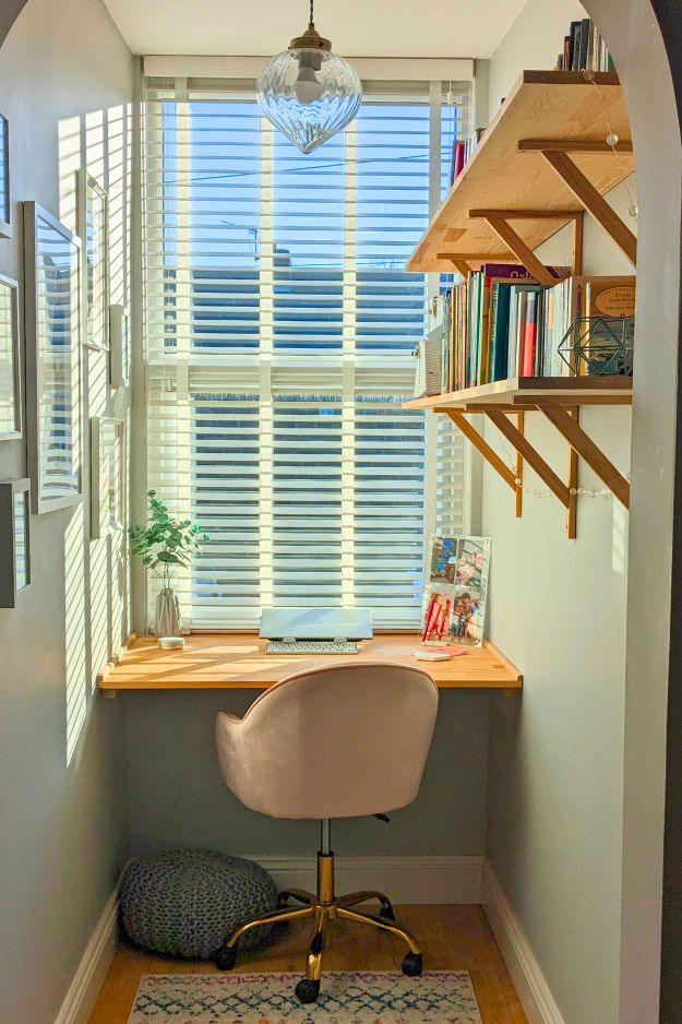 For a tiny space like this, wall shelves are basically the best move. They keep the desk area clear, add storage without eating floor space, and honestly make the whole nook feel more “intentional” instead of cramped. Just make sure the lower shelf isn’t sticking out too far, because that’s the kind of setup where you will brain yourself at least once a week.