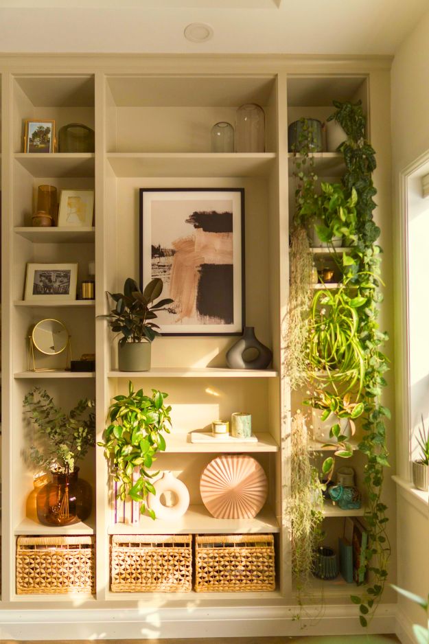u/always_blue_sky basically proved that IKEA Billy bookcases can look fully custom if you treat them like real built-ins. The trim work makes everything feel seamless, and that soft beige paint instantly warms up the whole home office (instead of giving “white box storage”). And the styling is so good: balanced plants, art as the centerpiece, and those rattan baskets grounding the bottom like a designer would. It’s functional, calm, and honestly looks way more expensive than it is.