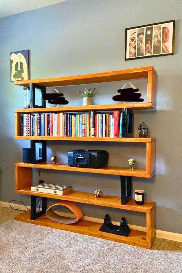 This one feels like a modern bookshelf and a little optical illusion at the same time, and u/TWBeta pulled it off with surprisingly basic materials: construction-grade pine, sanded smooth, plus those spray-painted 2×2 “black squares” that make the whole thing look like it’s zig-zagging or floating. I also love the practical sizing logic, they are built around a tallest-book height (about 10″), which is smart… until you fall in love with oversized art books. If I copied this, I’d upgrade the joinery for moving day (box joints, splined miters, anything stronger than butt joints) and consider a discreet wall anchor if kids or pets are in the house.