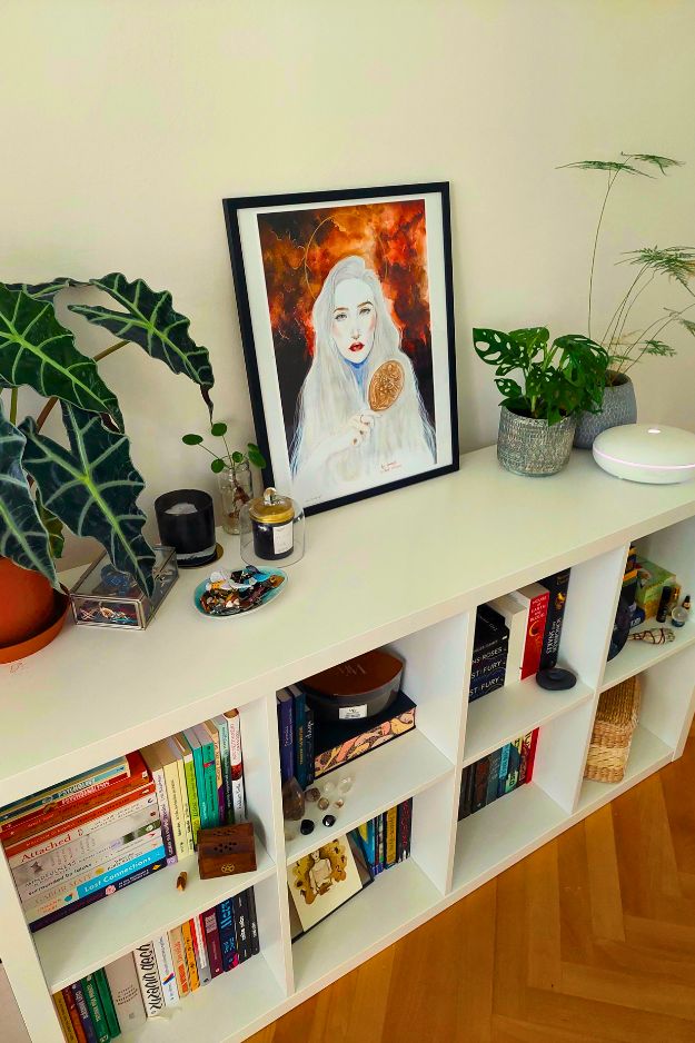This bedroom bookshelf setup is such a good example of how an IKEA Kallax can look genuinely elevated when it’s styled with intention. Even though it’s a small shelf, the owner made it feel like a whole vignette with the mix of books, dreamy art, and that plant lineup (Alocasia, pilea, monstera adansonii, asparagus fern) giving it a soft “plant life” vibe without turning messy.