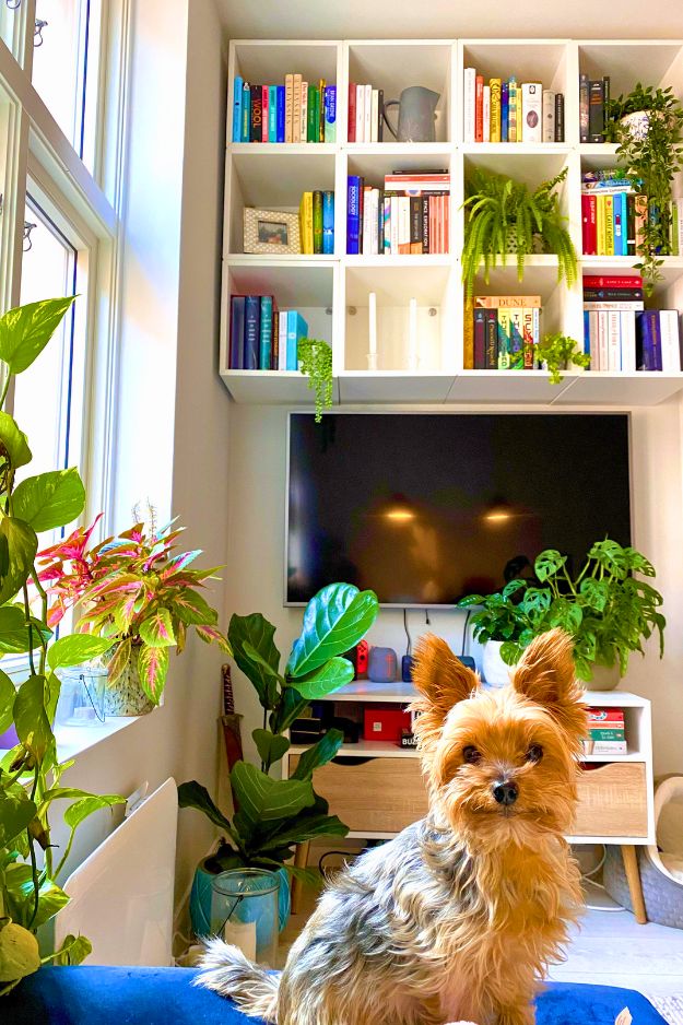 This bookshelf setup honestly made me look at all the wasted space above a TV and feel slightly attacked. The floating shelf turns that usually-empty “dead zone” into something useful and pretty, without making the room feel crowded. I love how it works like a mini built-in: books stay visible, the corner feels styled on purpose, and it adds height so the whole area looks more balanced.