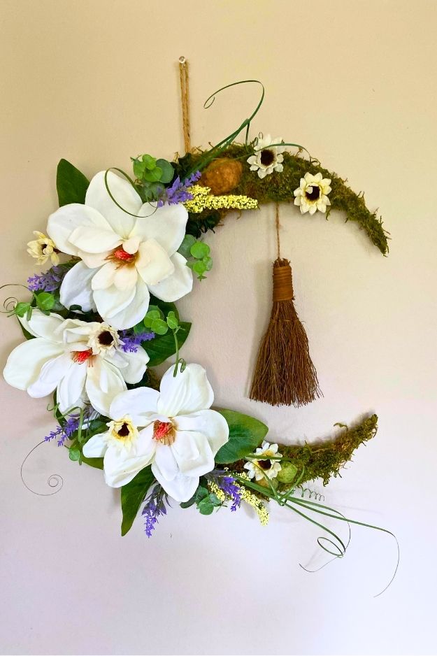 This one isn’t symmetrical or picture-perfect, but that’s exactly what makes it special. You can feel the effort and care that went into every little piece, from the feathers to the crescent shape. It’s not about precision; it’s about heart, and that’s what gives it its quiet, witchy charm. It feels personal, like a piece of someone’s spirit hanging proudly on that teal door.