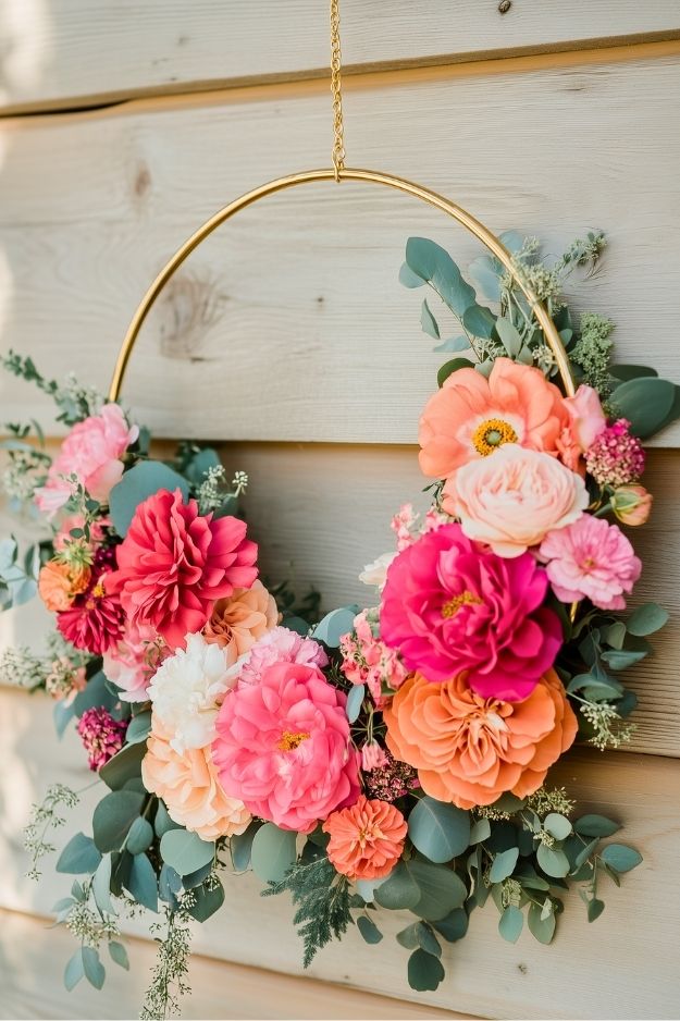 The mix of coral, blush, and magenta blooms looks effortless, but let’s be honest, pulling this off isn’t easy. Getting that balance of fullness and open space takes real skill. The gold hoop gives it such a modern edge, keeping it from looking too traditional. This is the kind of wreath that makes people go, “Okay, who made that?”