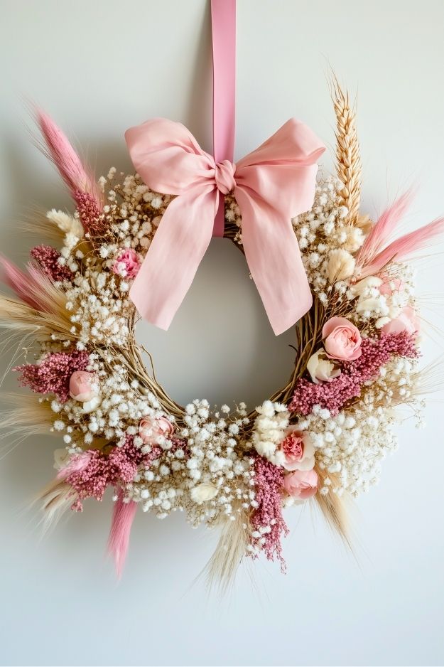 This wreath honestly feels like the soft girl version of spring decor, delicate, airy, and way too underrated. The pastel pink bow alone could make a rainy day feel cute, and the mix of dried wheat and tiny blooms gives it that perfect “fresh but not trying too hard” vibe. I seriously don’t get why more people don’t use this color combo; it’s calm, warm, and still feels like sunshine in floral form.
