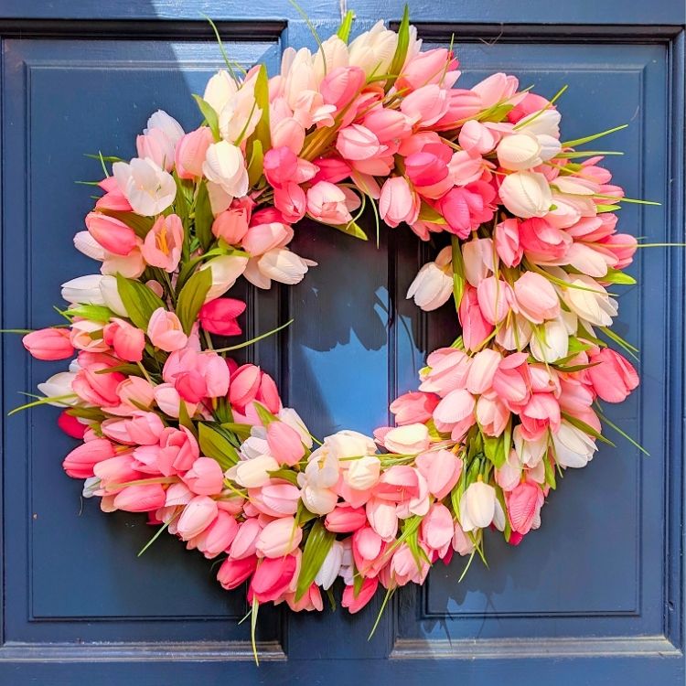 The colors feel softer and more natural, and the wreath looks fuller and more alive, like it actually belongs on that blue door. The fact that it’s made with faux tulips from Michael’s makes it even better; you don’t even have to worry about wilted petals.