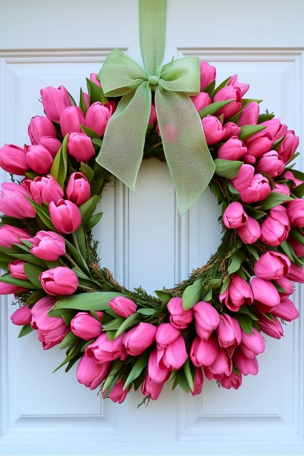 This tulip wreath is such a mood, bright, happy, and basically screaming “spring’s here, deal with it.” The pink tulips look so plump and fresh you almost want to water them, and that soft green bow gives it just the right pop without going all Barbie-core. It’s simple but feels fancy, like something that says you actually have your life together (even if you don’t). Honestly, hang this up and your door instantly becomes the prettiest thing on the block.