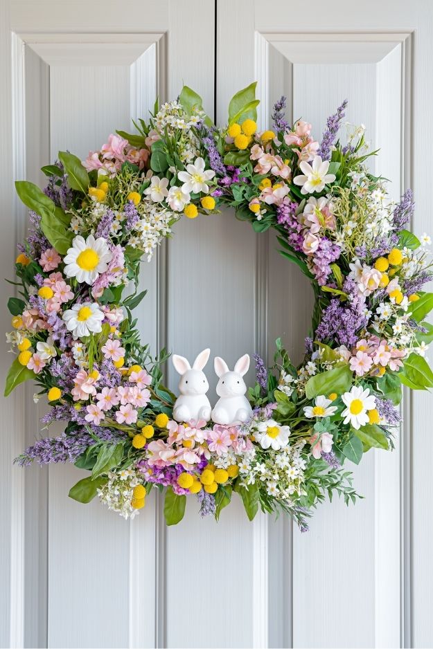 This wreath basically says, “yeah, I’ve got great taste” without you having to brag about it. The mix of daisies, lavender, and those little yellow pops feels so bright, and the ceramic bunnies at the bottom add just enough Easter charm to make people smile without going full cartoon mode.