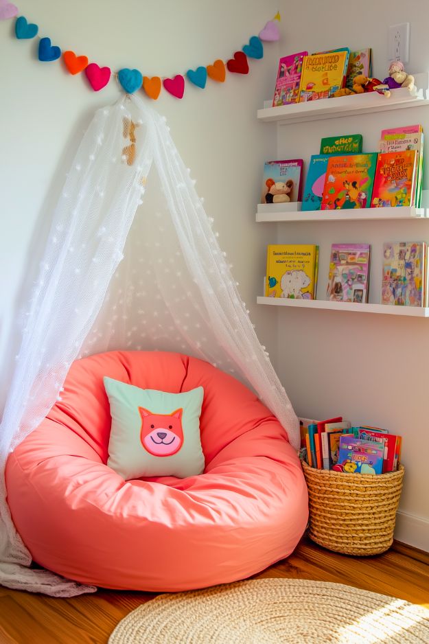 This little setup totally reminds me of the pillow forts I used to build as a kid, just a lot cuter and way more put-together. The soft coral bean bag, the heart garland, and that gauzy canopy make it feel like a mini hideout for reading or daydreaming. It’s simple, cozy, and full of that kind of magic you never really outgrow.