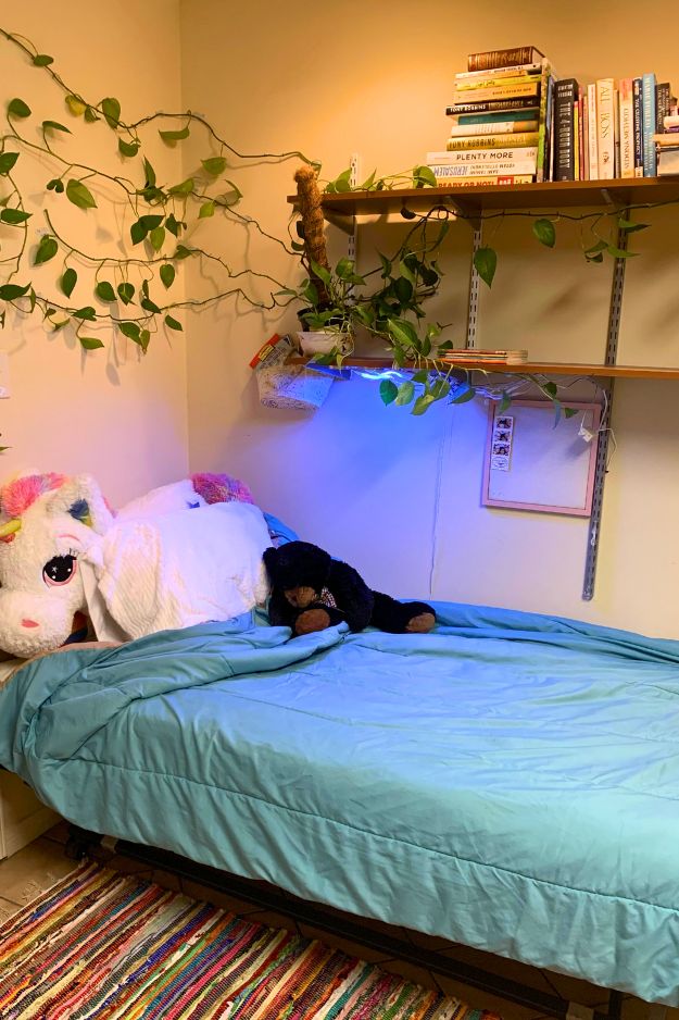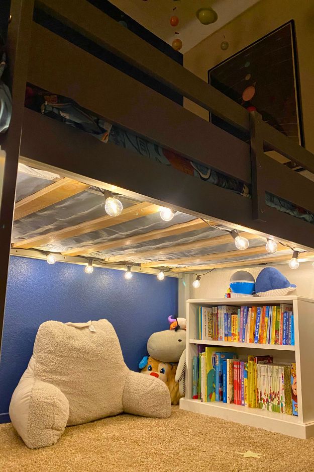 What I loved most about Kimber’s nook is how it turns the dead space under a loft bed into a tiny hideout that feels magical and practical at the same time. The LED string lights keep it bright without being harsh, and that backrest pillow, headless bear or not, actually makes the space comfortable enough to sit with a stack of books.