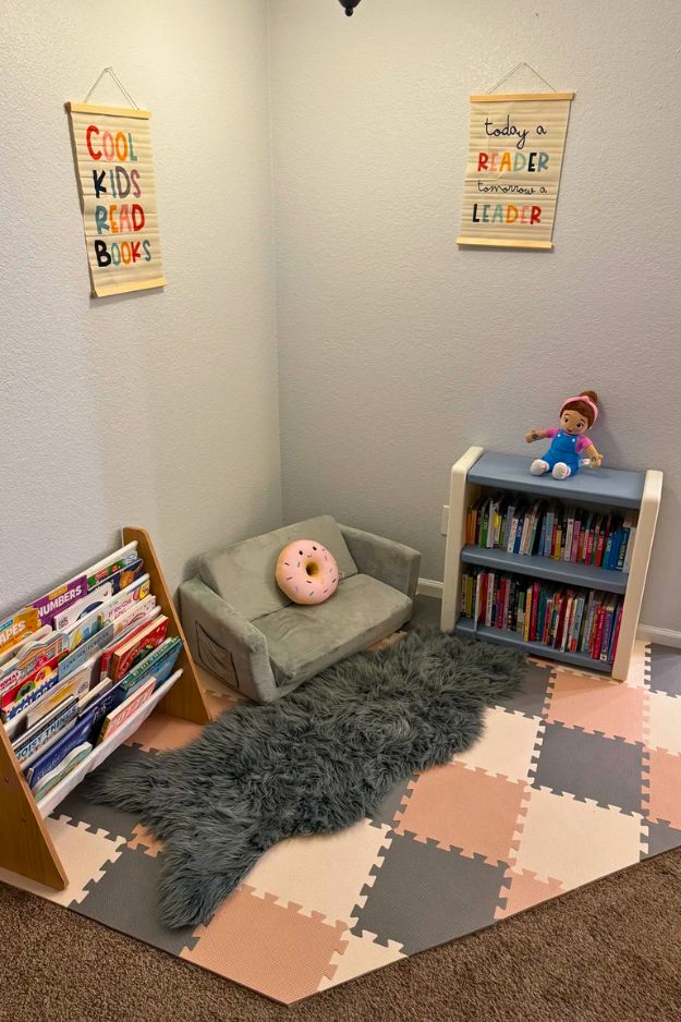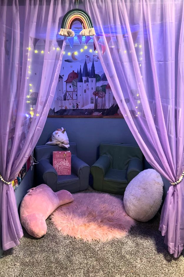That little snuggery is going to make their daughter’s core memories. Love rainbow light, the whimsical mural, and shelves filled with pretty picture books, it feels designed not just to be cute but to make reading irresistible.