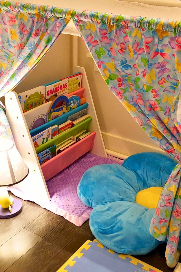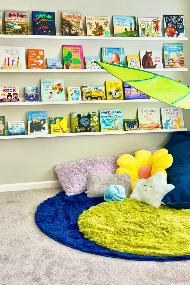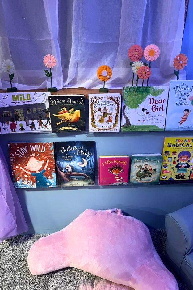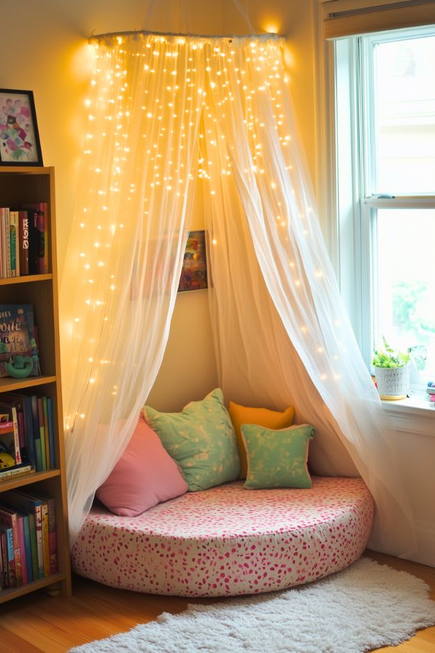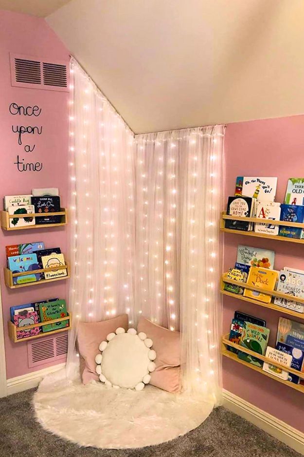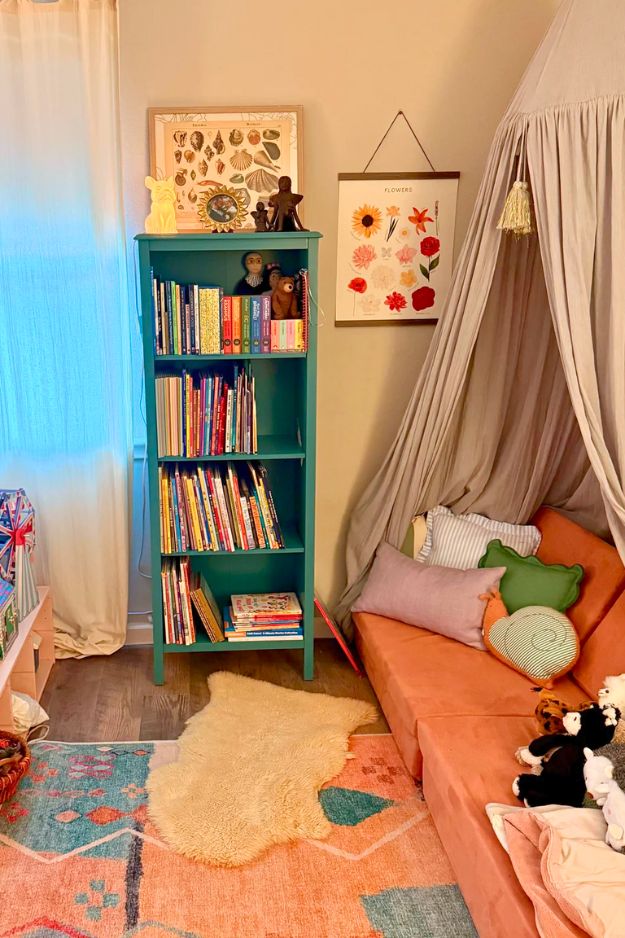 The canopy, curtains, and string lights instantly make this space feel magical, but the real win is how practical it is too, front-facing shelves, soft seating, and easy tweaks as her daughter grows. You can tell it’s not just for reading; it doubles as a calming down spot too.