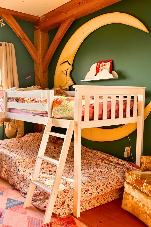 This room is honestly too cute to be true, the giant wooden moon alone feels like it was plucked from a fairytale. I love that it started life as a wedding prop and now doubles as a dreamy backdrop for bedtime.