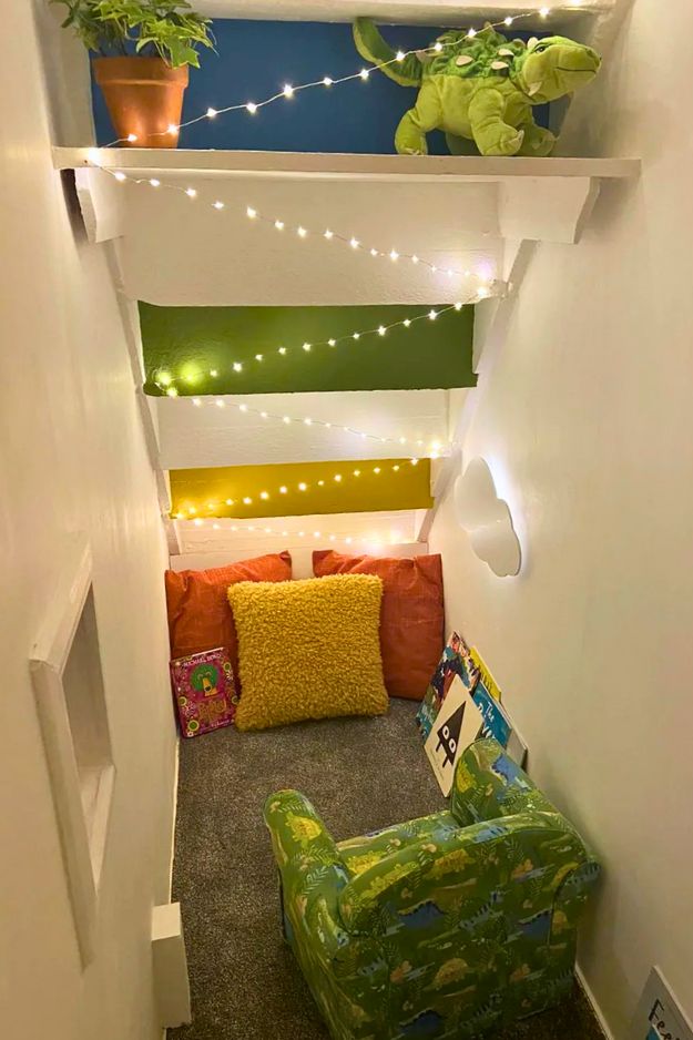 This might be the ultimate gift for a son who’s obsessed with dinos, a whole little “dino den” under the stairs. Cozy nook, books within reach, and a T-Rex head watching over? That’s way cooler than any toy you could buy off the shelf. By Super-flewis