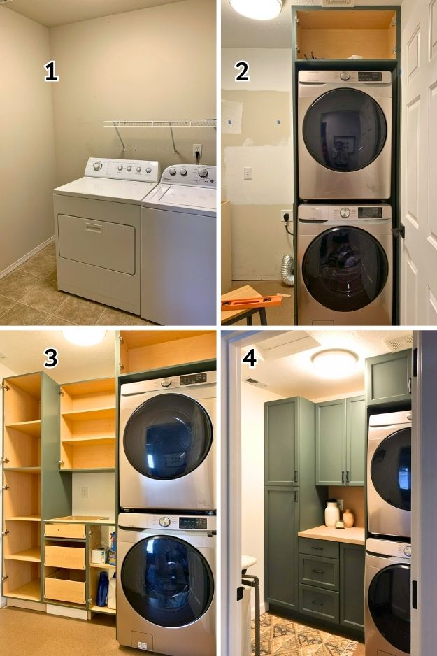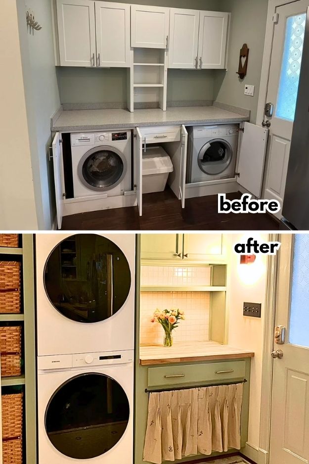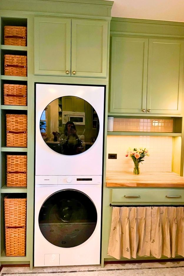 The tight, built-in look feels oddly luxurious, like the washer and dryer got promoted to “appliance furniture,” and those perfectly sized basket cubbies scratch a very specific organizing itch. I do get the anxiety about future appliance sizes and losing folding space, but the trade-off reads intentional: less clutter, more flow, and a clean, finished look. And I’m with them on the sage green too. It’s not a “trend panic” color to me, I’d paint it and happily leave it for years.