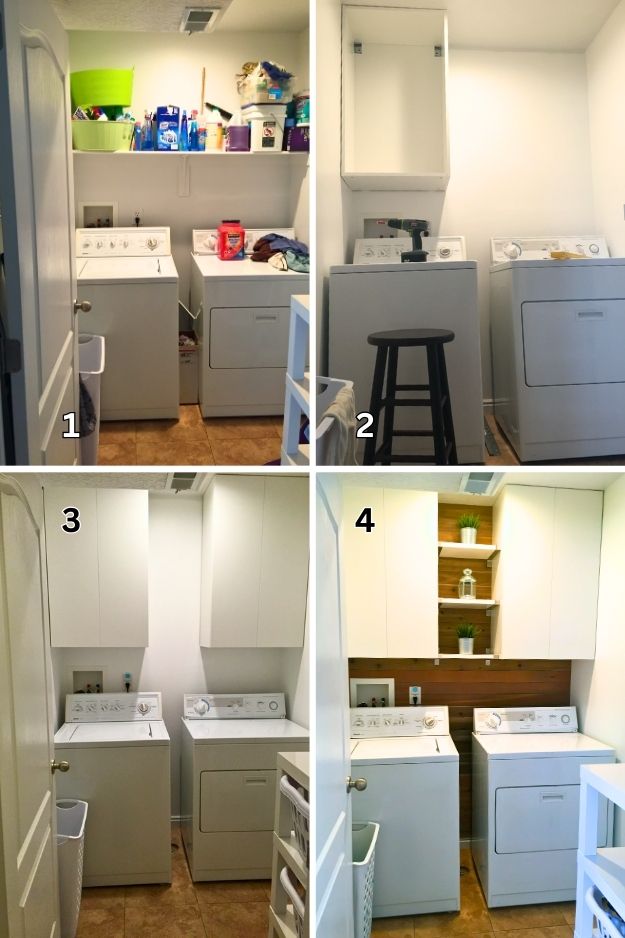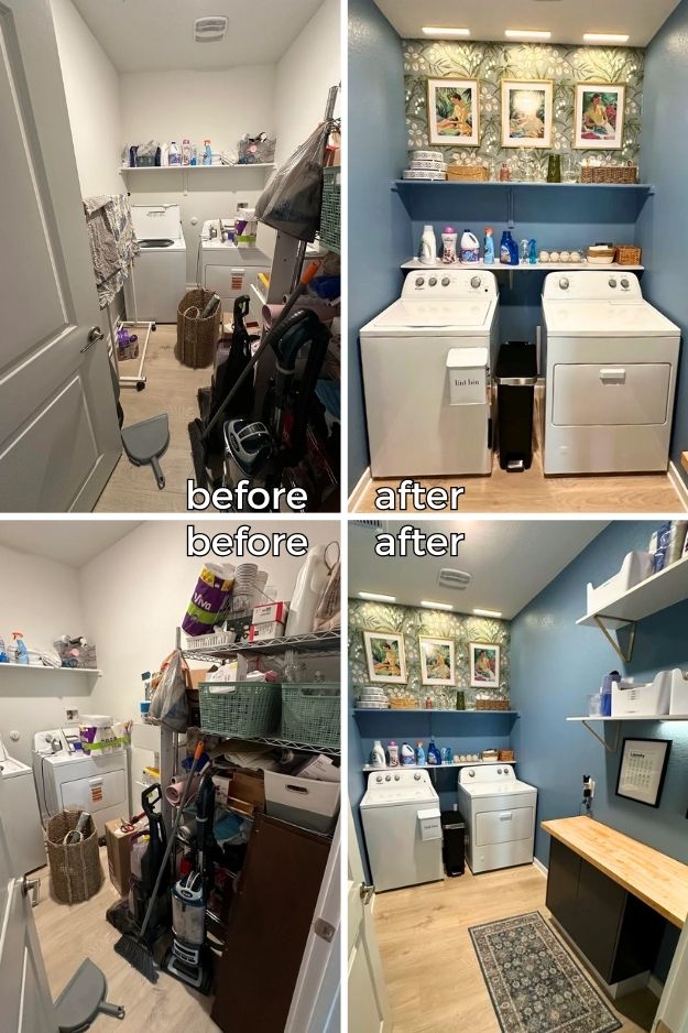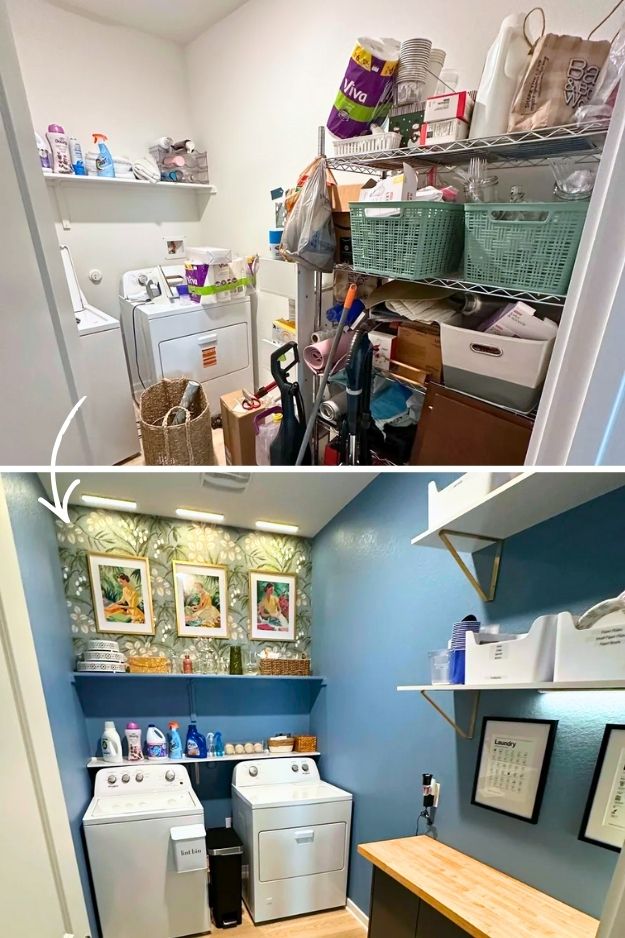 This tiny laundry room makeover is such a good reminder that you don’t need a huge space (or even a full washer–dryer spread) to make laundry feel manageable. Stacking the machines was the smart move here, especially when storage is tight and every inch matters.