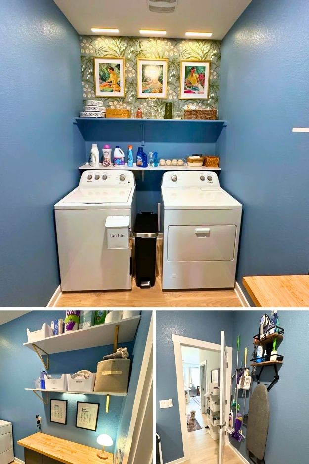 Proof that a laundry room doesn’t have to feel sad or purely utilitarian. The deep blue paint paired with that leafy wallpaper completely shifts the mood, and the framed prints plus warm lighting make it feel calm instead of chore-heavy.