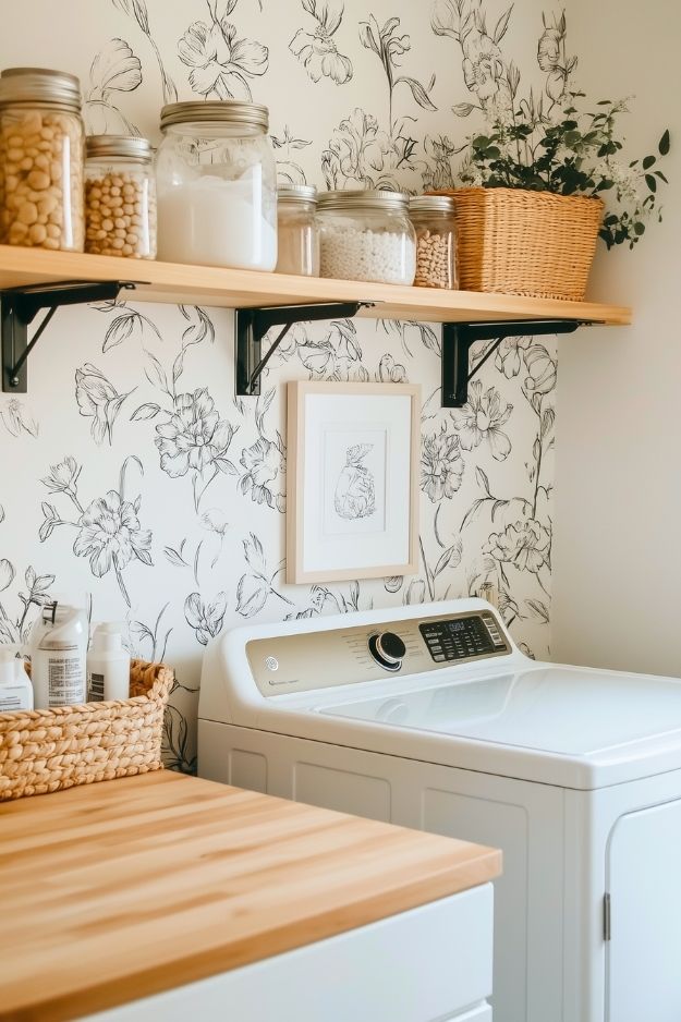 Soft florals and warm wood instantly make laundry feel less like a chore and more like a quiet reset moment. The open shelf styling really nails the balance here, glass jars keep things visible and tidy, while woven baskets soften the look and make everything look more stylish.