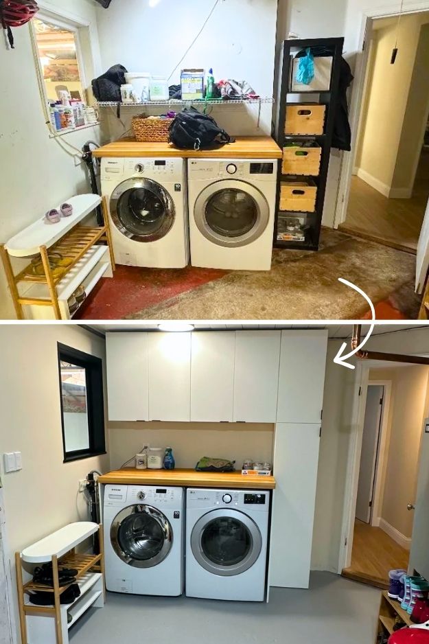 Going from a scary, unfinished basement to something bright and genuinely usable is what impressed me most about u/stereo_mike_’s laundry room. Paint does most of the heavy lifting here, especially on the floor and walls, and the shiplap ceiling is such a smart, budget-friendly way to deal with an ugly overhead. The mix of IKEA cabinets and a repurposed countertop feels practical but still intentional, not like a temporary fix. I also appreciate how clean and restrained it is, nothing overdesigned, just thoughtfully upgraded.