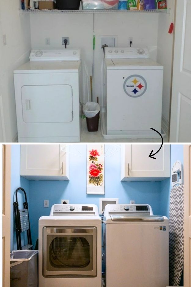 The clean cabinets and calm, happy color instantly make the room feel bigger, and the built-in counter creates a legit folding zone without eating up floor space. I also love that they planned for real-life stuff like access panels and vent/hookup reach, because pretty is nice, but practical wins.