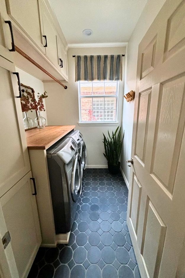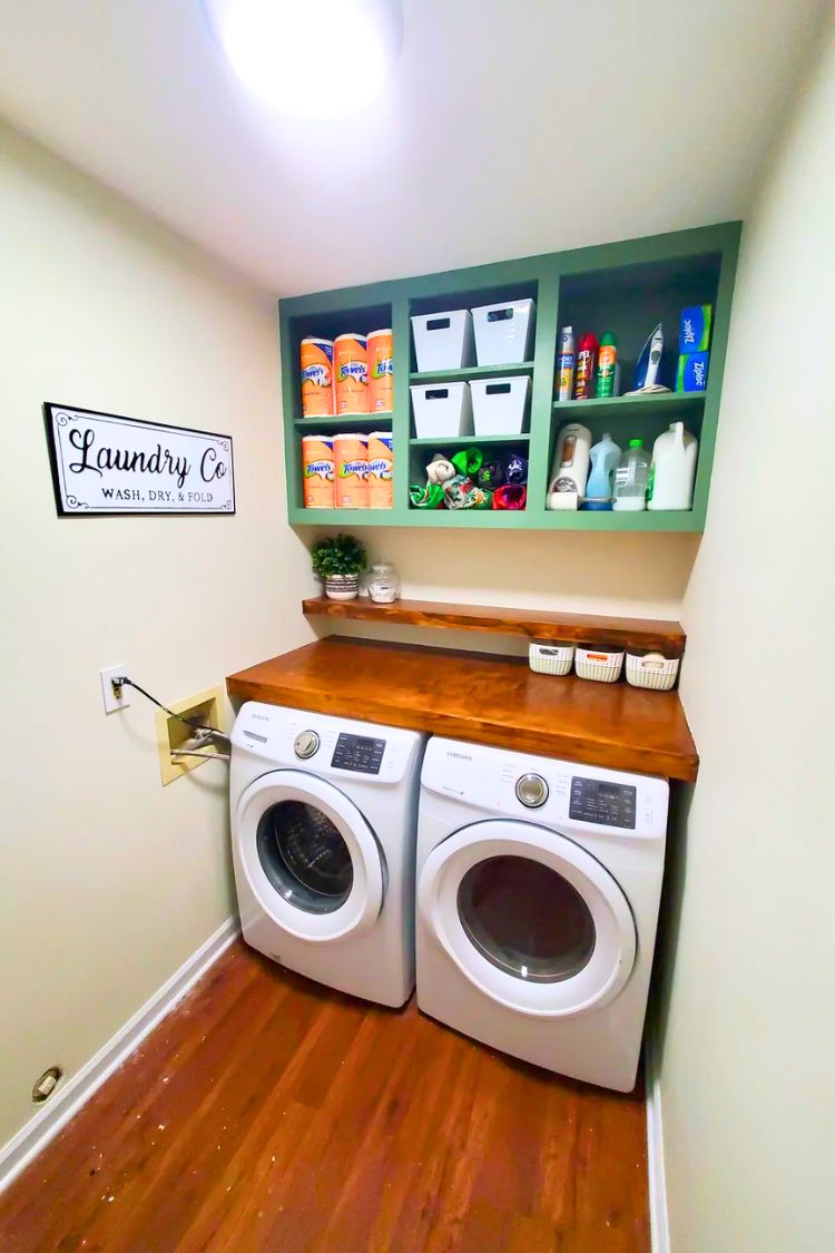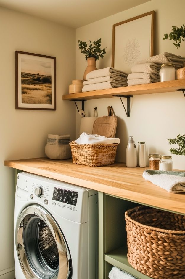 Not every home has the luxury of a full laundry room (or even space for both machines), so I really appreciate setups like this that make a single washer feel intentional, not like a compromise. The warm wood counter and that soft sage cabinet color instantly calm the whole corner down, and the woven baskets make it feel collected and cozy instead of “random storage.”