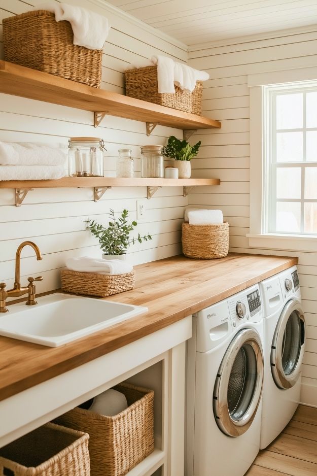This space feels more like a calm, sunlit pantry than a laundry room, and that’s exactly why it works. The warm wood, shiplap, and open shelving set such an easy, breathable vibe, but it’s really the woven baskets that soften everything. I know they’re not as durable or wipeable as plastic bins, but I’d happily use them for towels and dry storage just for how much warmth they add.