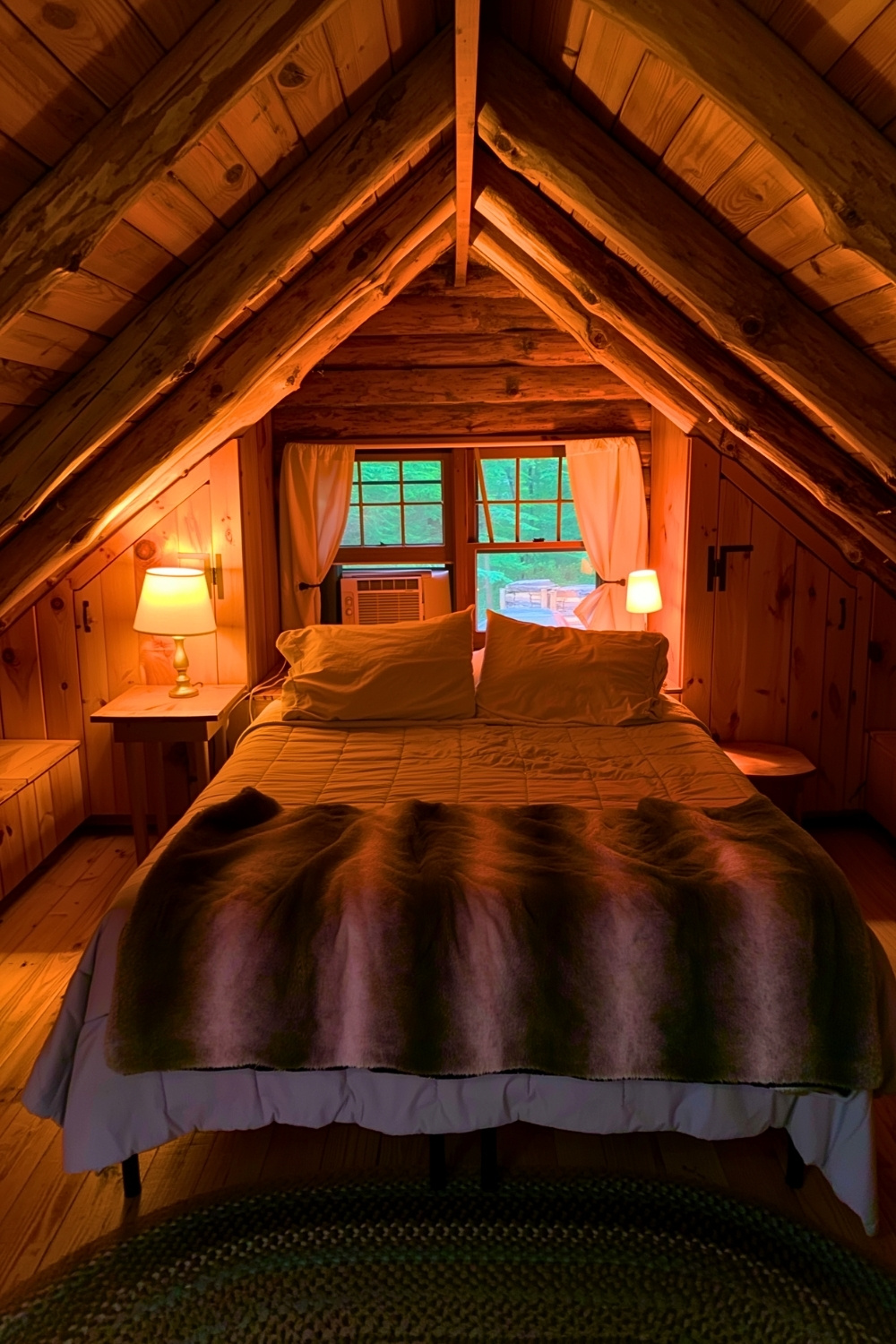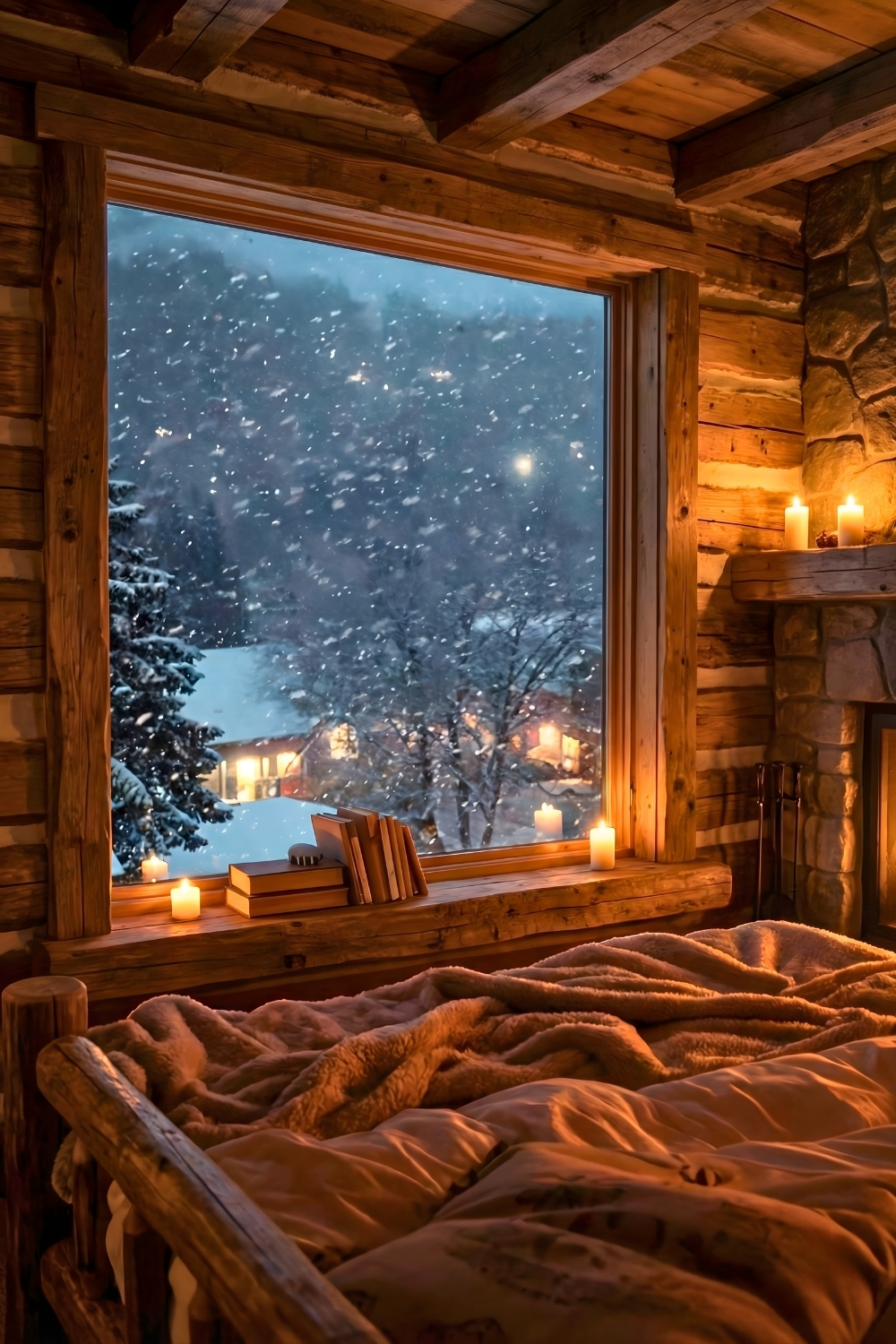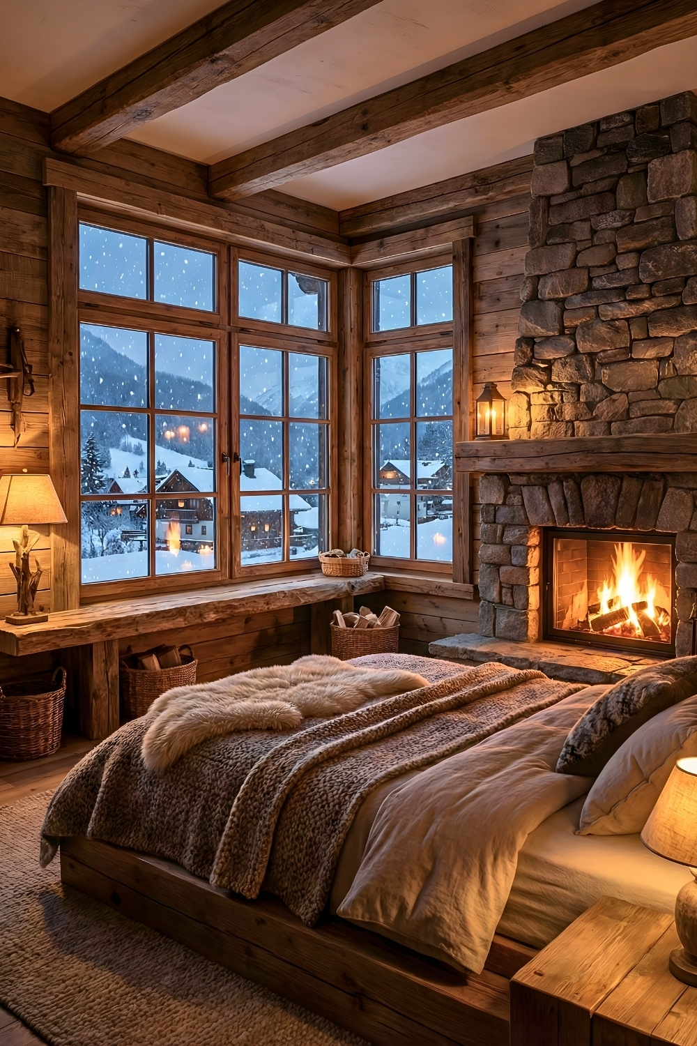 This rustic winter cabin bedroom feels like the perfect snowy-night hideaway, with a glowing fireplace and big wooden windows framing the forest like a living painting. Creating warmth in a cabin bedroom becomes effortless when you layer soft bedding, warm lighting, and natural wood textures to build a cozy mountain atmosphere. I love how romantic and calm this setup feels, almost like the world slows down the moment you look at it.