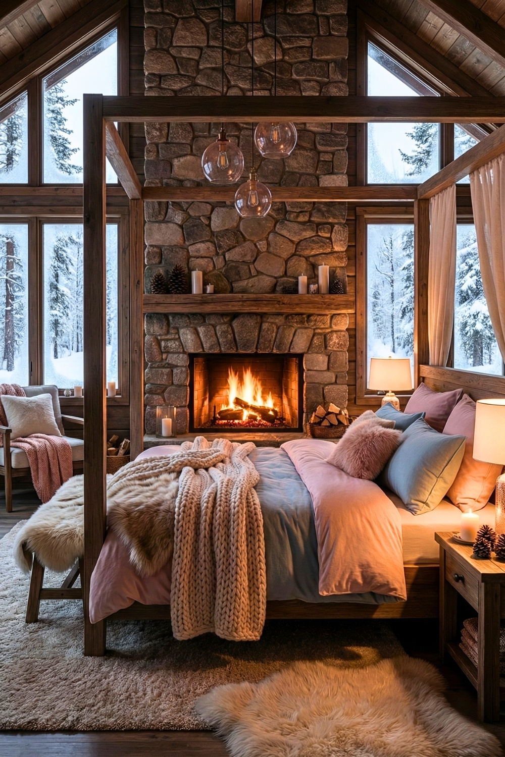 Stepping into this rustic cabin bedroom instantly feels like a warm embrace, with the stone fireplace, pastel bedding, and chunky knit blankets creating that dreamy winter atmosphere everyone searches for. The way the firelight reflects on the wooden frame makes me love this space even more – it’s the kind of cozy retreat that turns long snowy nights into something unforgettable.