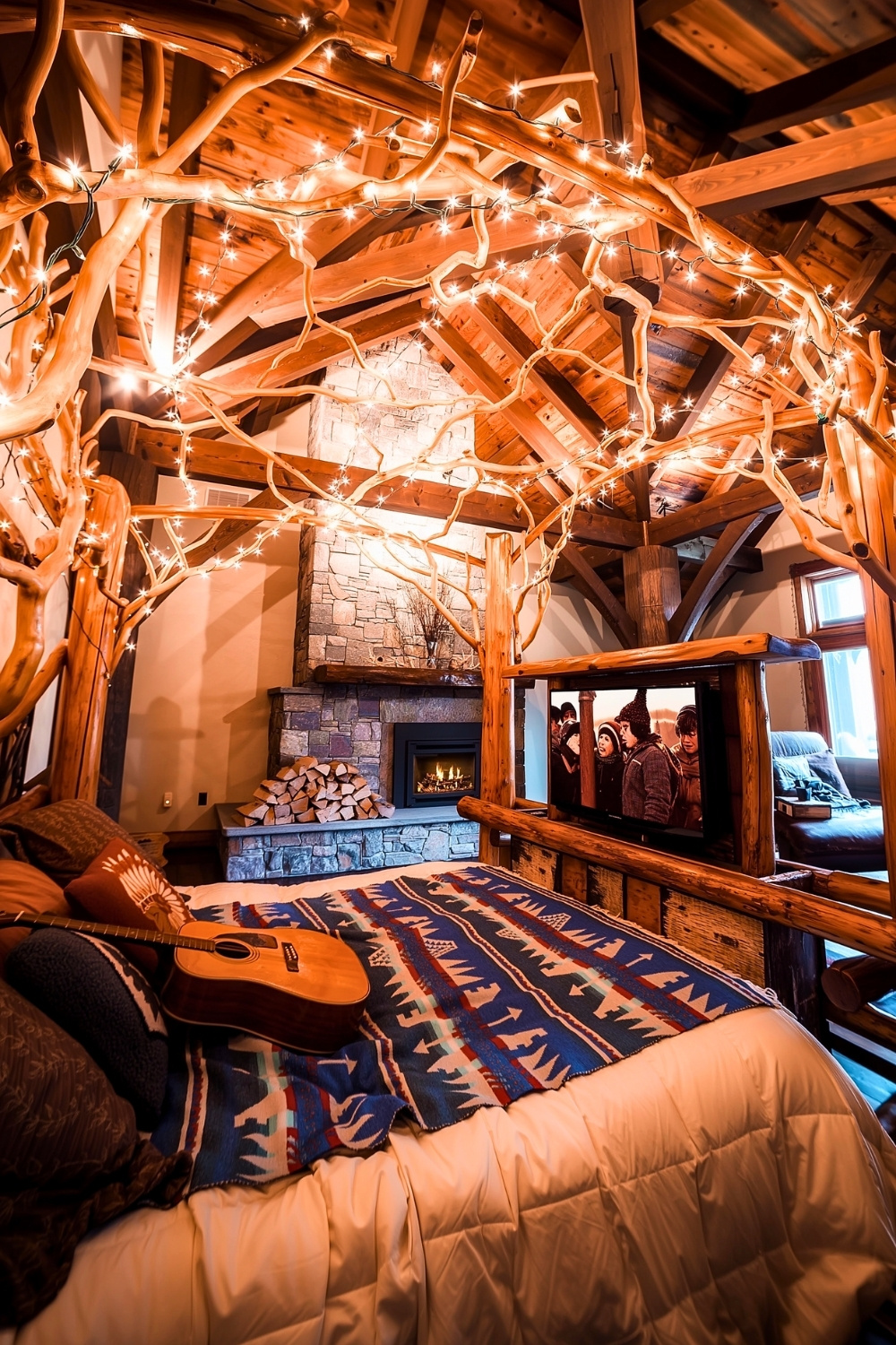 I’m also obsessed with how magical this winter cabin bedroom by u/PastyMcBasicFace feels. The branch-style canopy wrapped in warm lights, the glowing fireplace, and the log-frame bed create a rustic atmosphere that feels both romantic and homey. And with that Christmas movie playing, it becomes the exact cozy escape most of us dream about on cold winter nights – warm colors, lodge vibes, and pure comfort.
