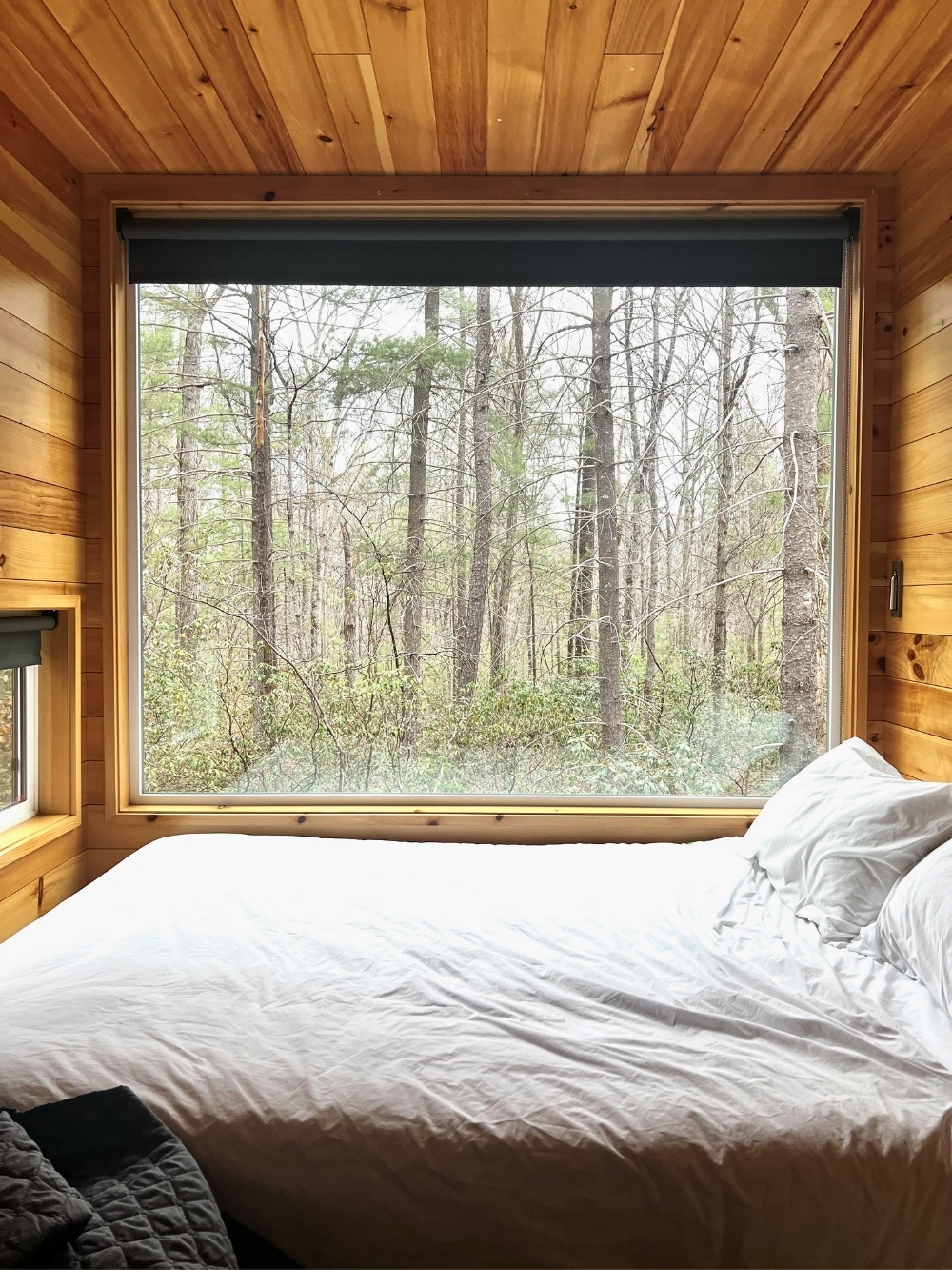Another peaceful moment appears in this simple cabin bedroom captured by u/LacyTing. The big windows and quiet forest views do all the work, while the clean bedding and warm wooden walls keep the look modern yet rustic. It solves a big problem for travelers who want a cozy winter space with a minimalist aesthetic – tiny, calming, and beautifully designed.