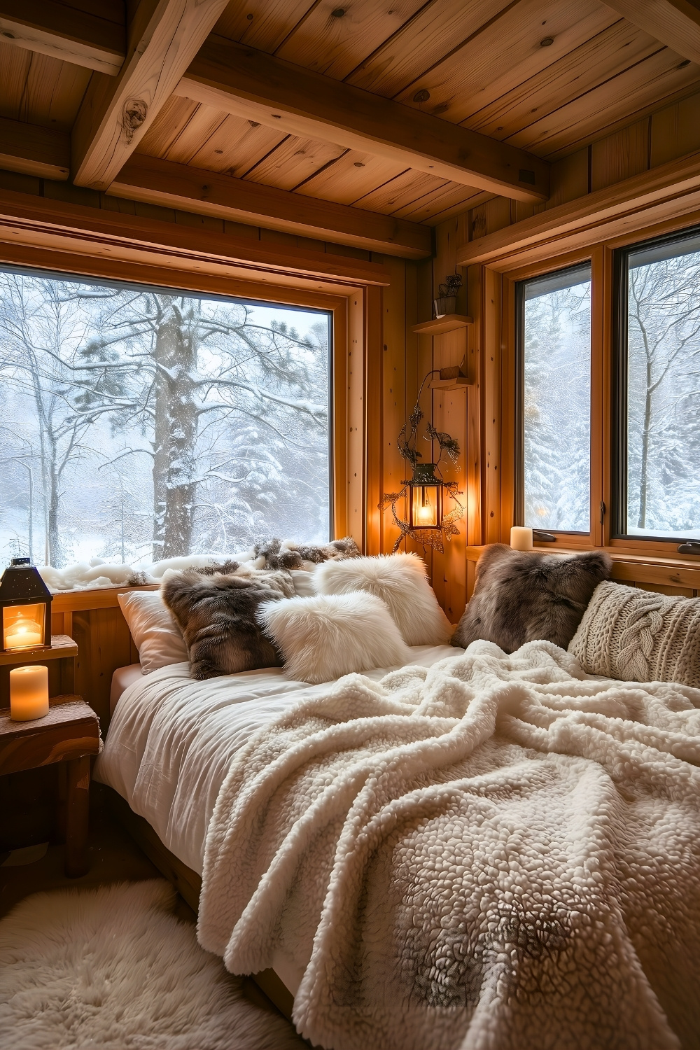 Nothing beats the snug, cottage-like charm of this tiny wooden bedroom tucked against a snowy forest backdrop, where soft fur pillows and lantern lighting build a soothing, rustic winter vibe. I’m drawn to how simple the design is yet how warm it feels – like a little hideaway you’d escape to for quiet nights, books, and pure calm.