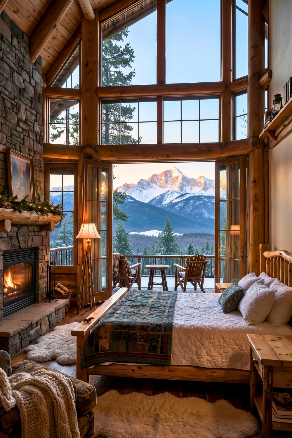 I can’t get over how luxurious yet simple this corner-window cabin bedroom feels, especially with the stone fireplace and wooden ceilings grounding the whole rustic aesthetic. Big windows allow the snowy landscape to function as natural decor, a clever idea for anyone designing winter lodge bedrooms or forest-facing cabin interiors. My heart honestly melts looking at this cozy scene, and I can imagine staying here for hours just listening to the fire.