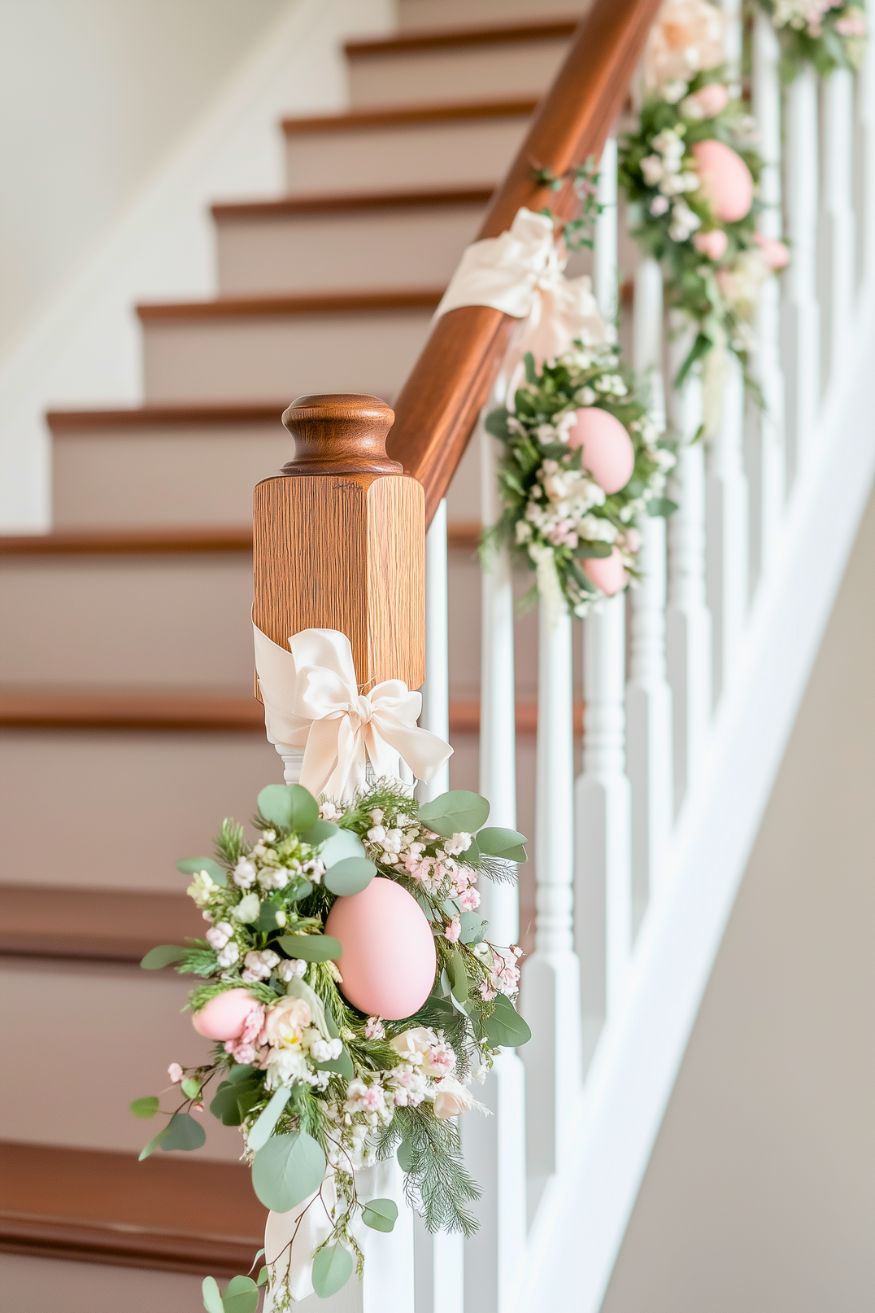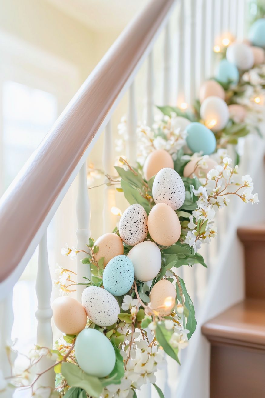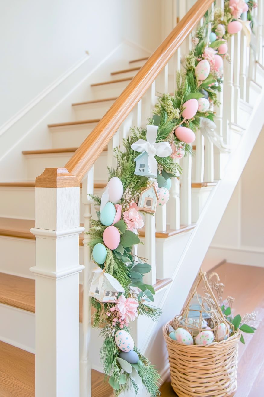 This one just simply had me at the very first. The soft pastel eggs and little birdhouses bring such a sweet, gentle energy, almost like a tiny Easter village winding up the railing. Mix faux greenery with pastel accents and let the colors do the talking if you want this at home.