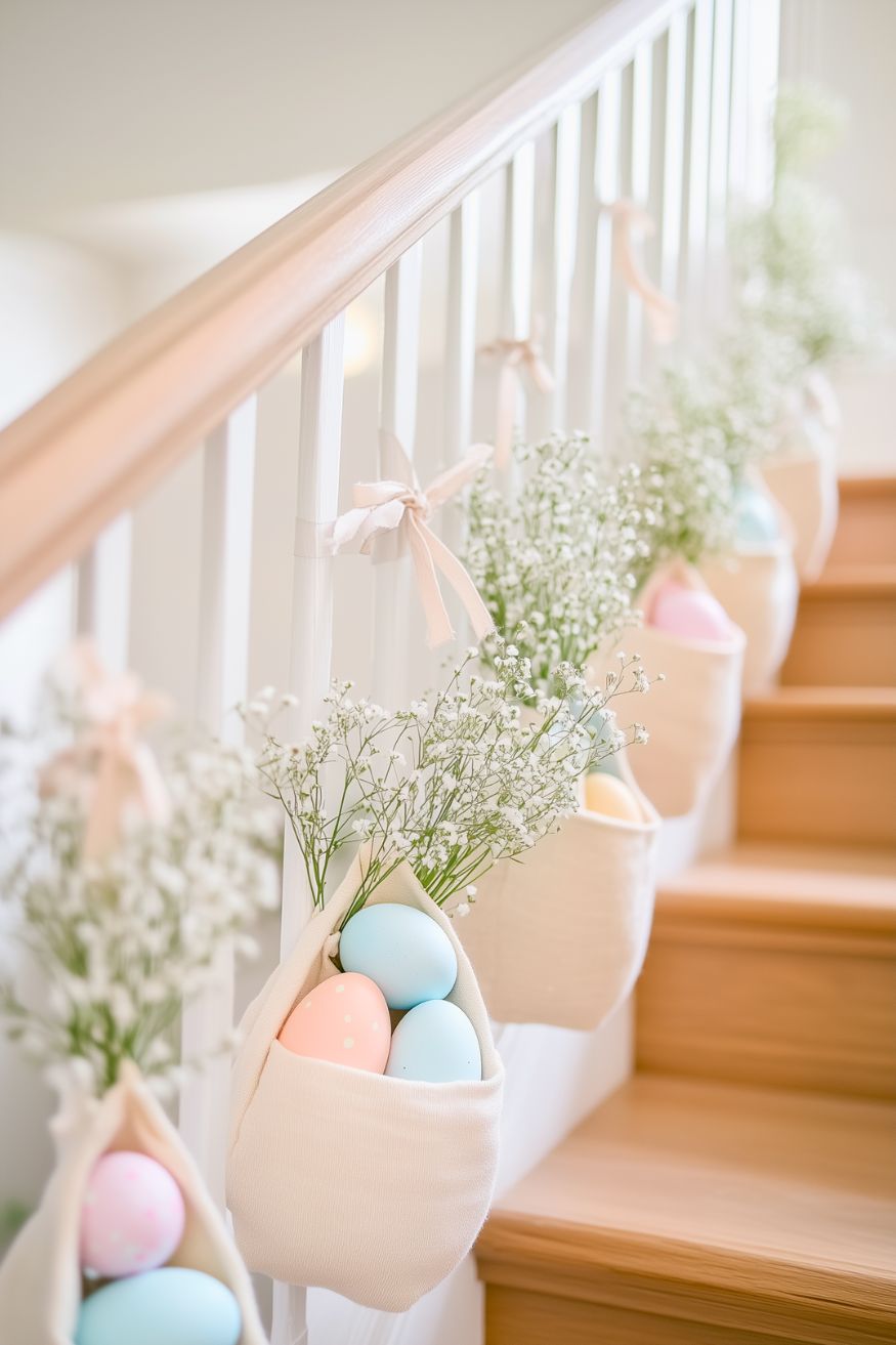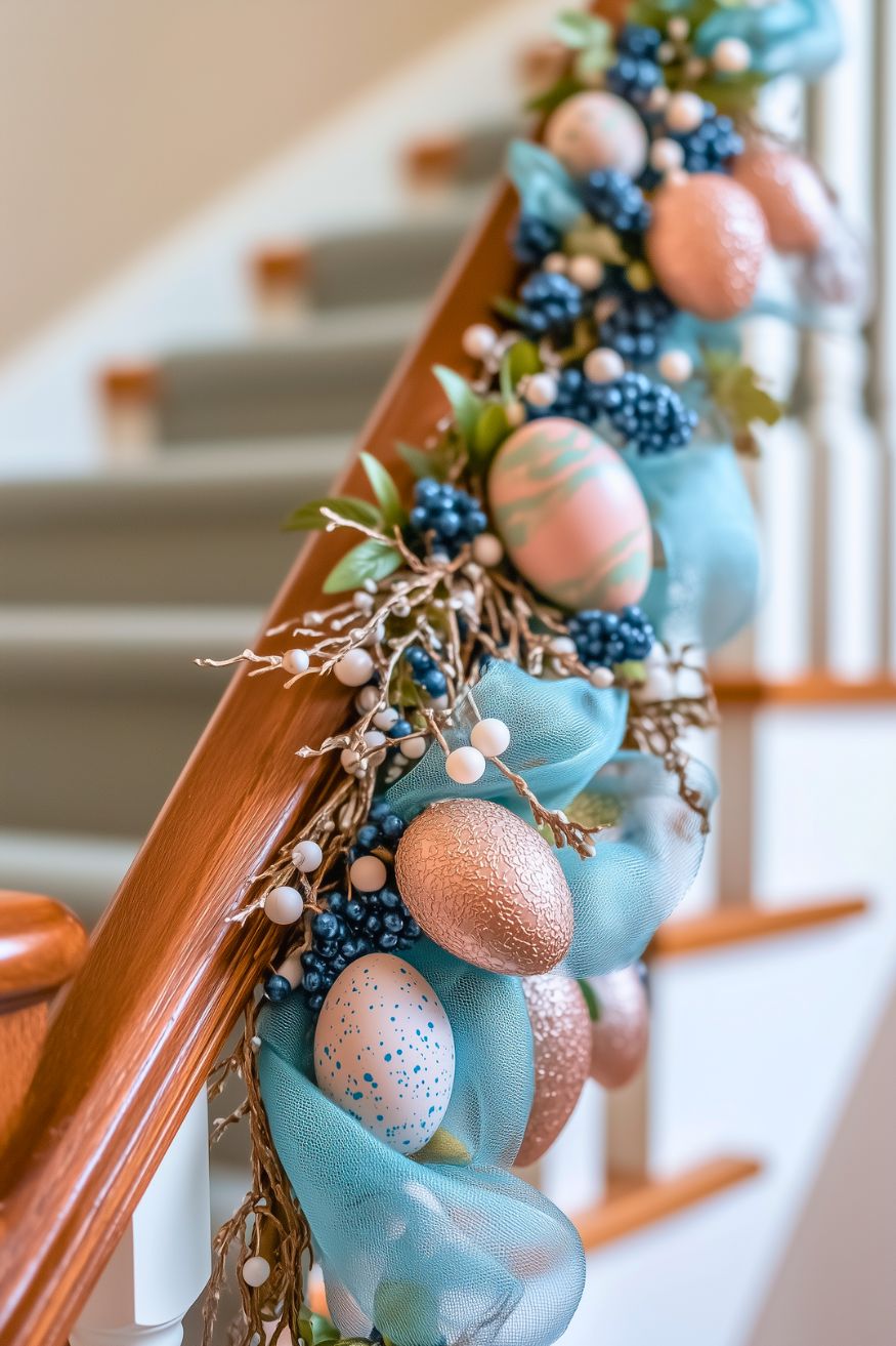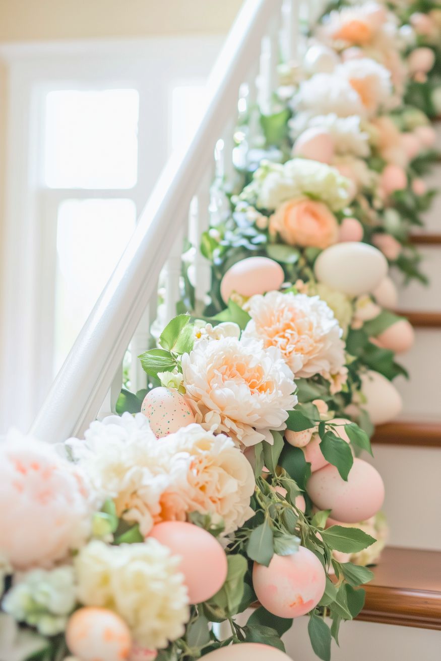 This one just simply had me at the very first. The soft pastel eggs and little birdhouses bring such a sweet, gentle energy, almost like a tiny Easter village winding up the railing. Mix faux greenery with pastel accents and let the colors do the talking if you want this at home.