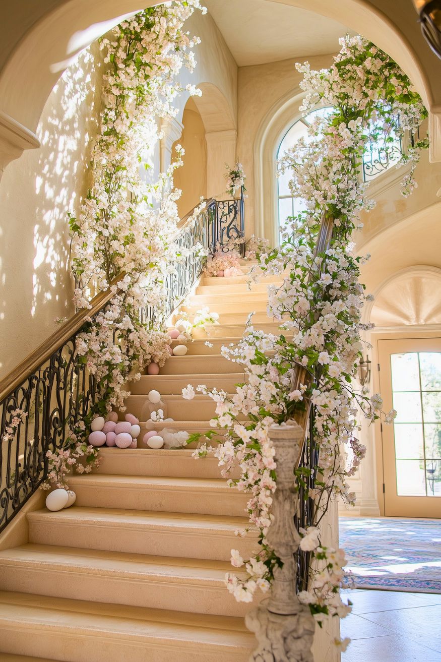 I bet this staircase will make you feel like walking into a spring daydream. The soft blush blossoms spill over the railing in the most effortless way. They also match perfectly with the Easter eggs overall. But what makes it even more gorgeous is the fullness of the branches here; they wrap the staircase in this airy, romantic glow without feeling heavy.