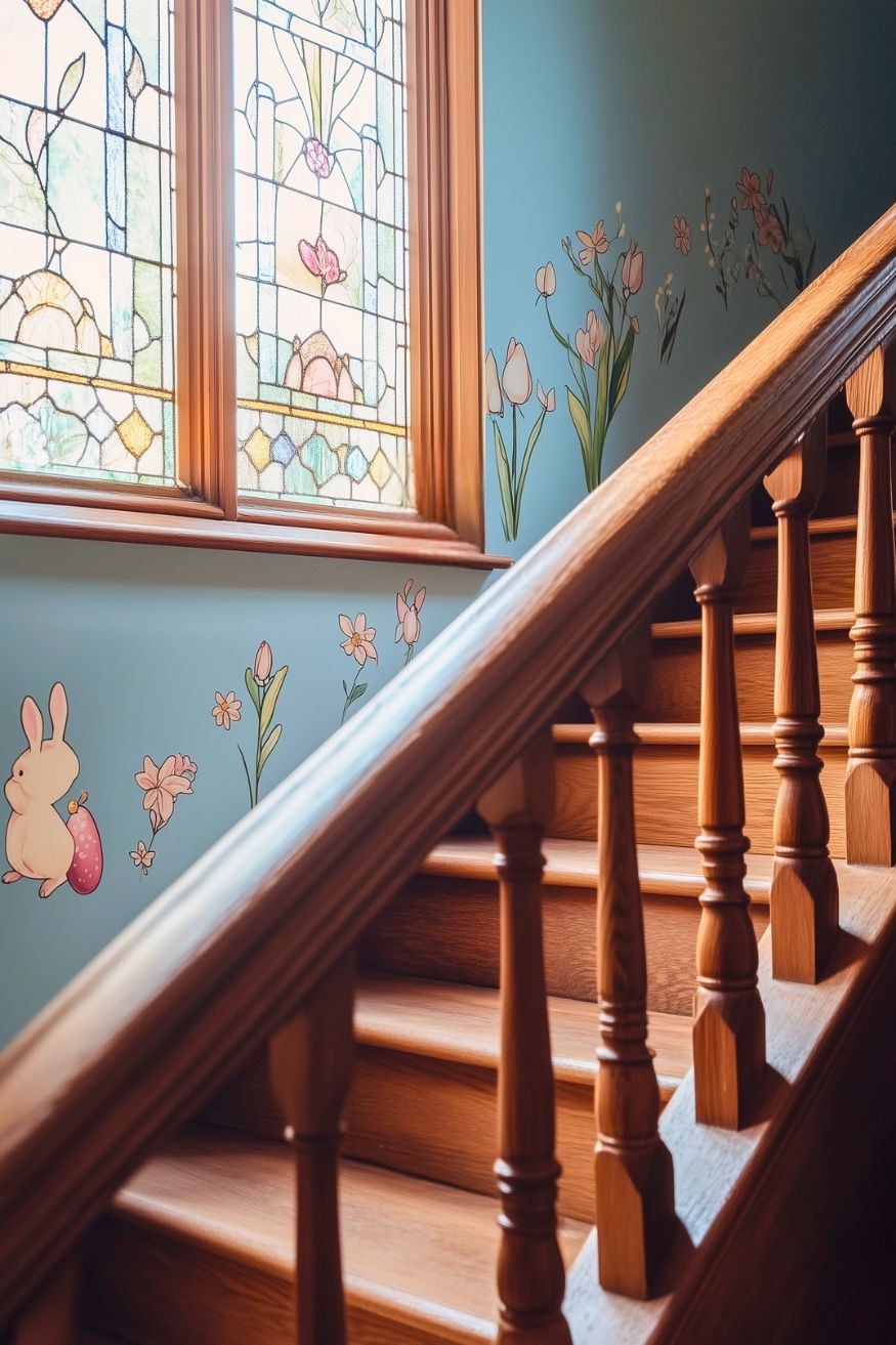 What really stood out to me here is how much character the homeowners uncovered simply by bringing the original wood back to life. Those stairs were once painted black, but u/BuffaloBrendan has made a huge transformation for them. And the handmade floral mural is definitely the star here for Easter.