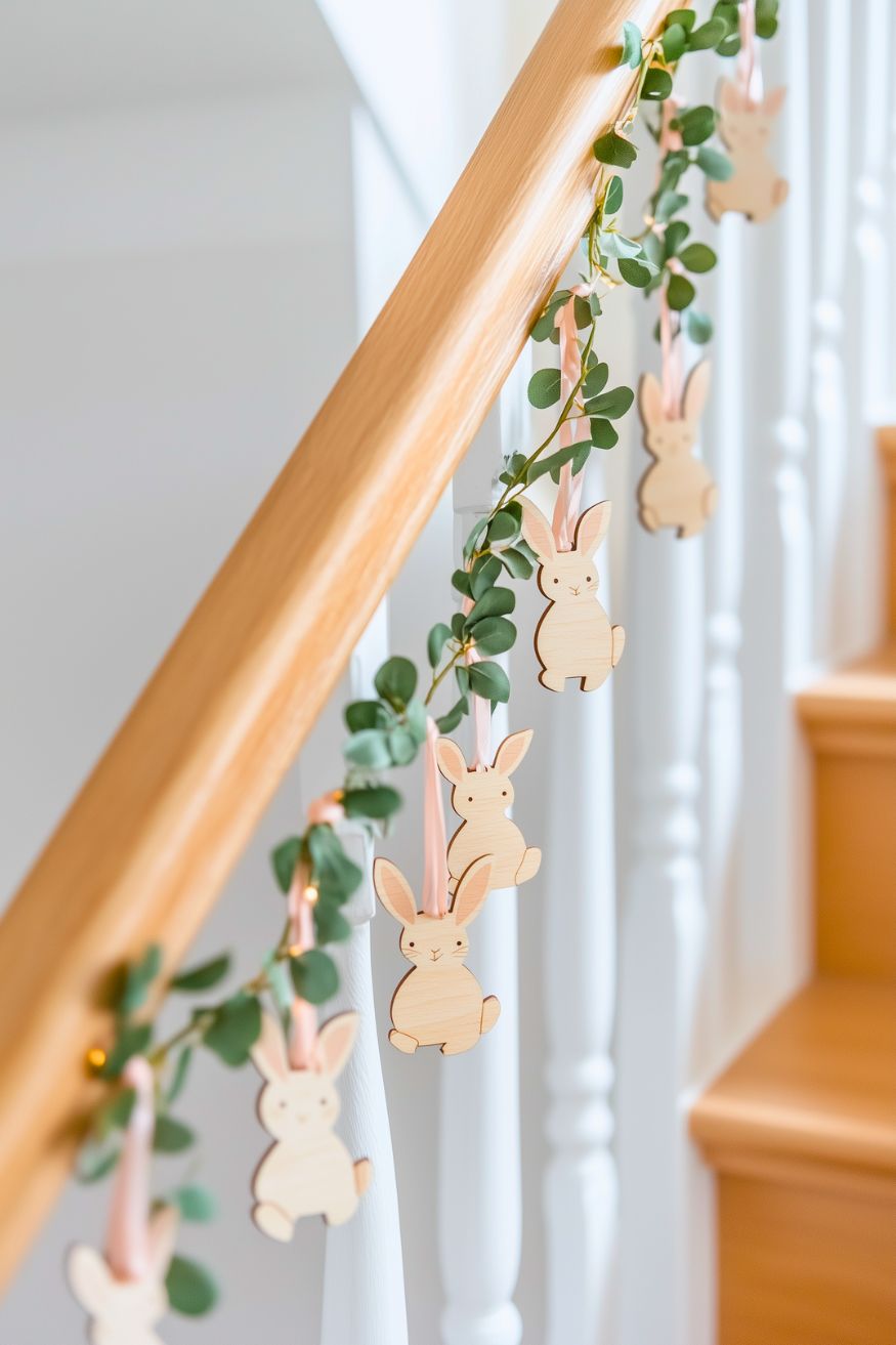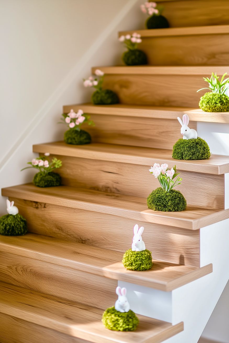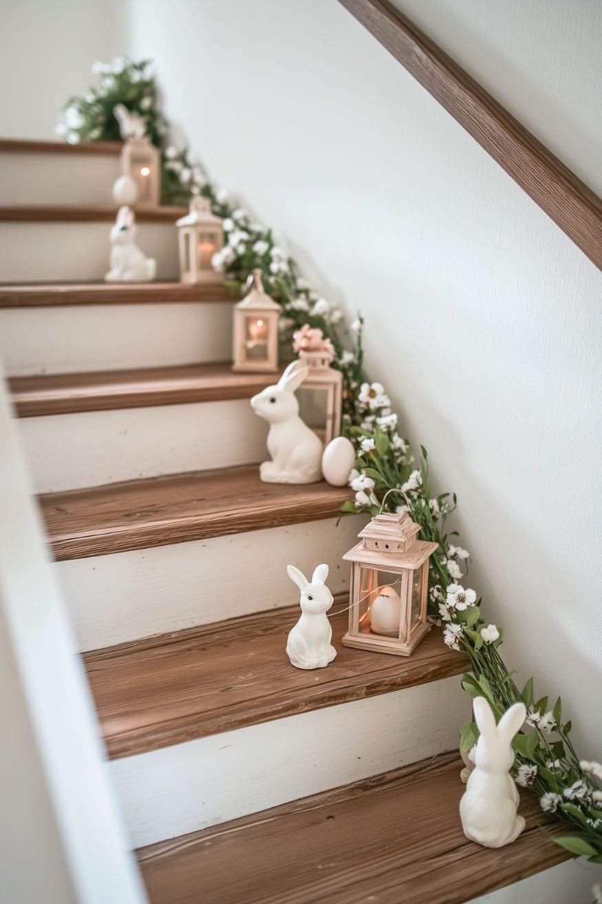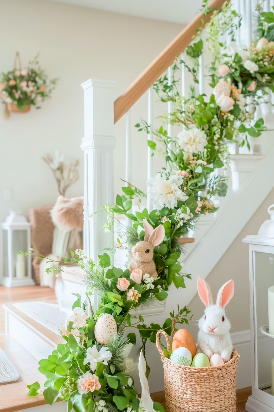 And if you don’t want to hang your decoration stuff on the railing, you can just stick it on each step. These florals trail up the steps without overwhelming the space. And the ceramic bunnies add just enough calm, cozy mood to the whole space.
