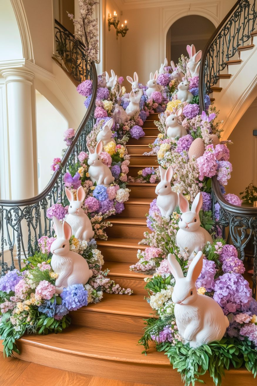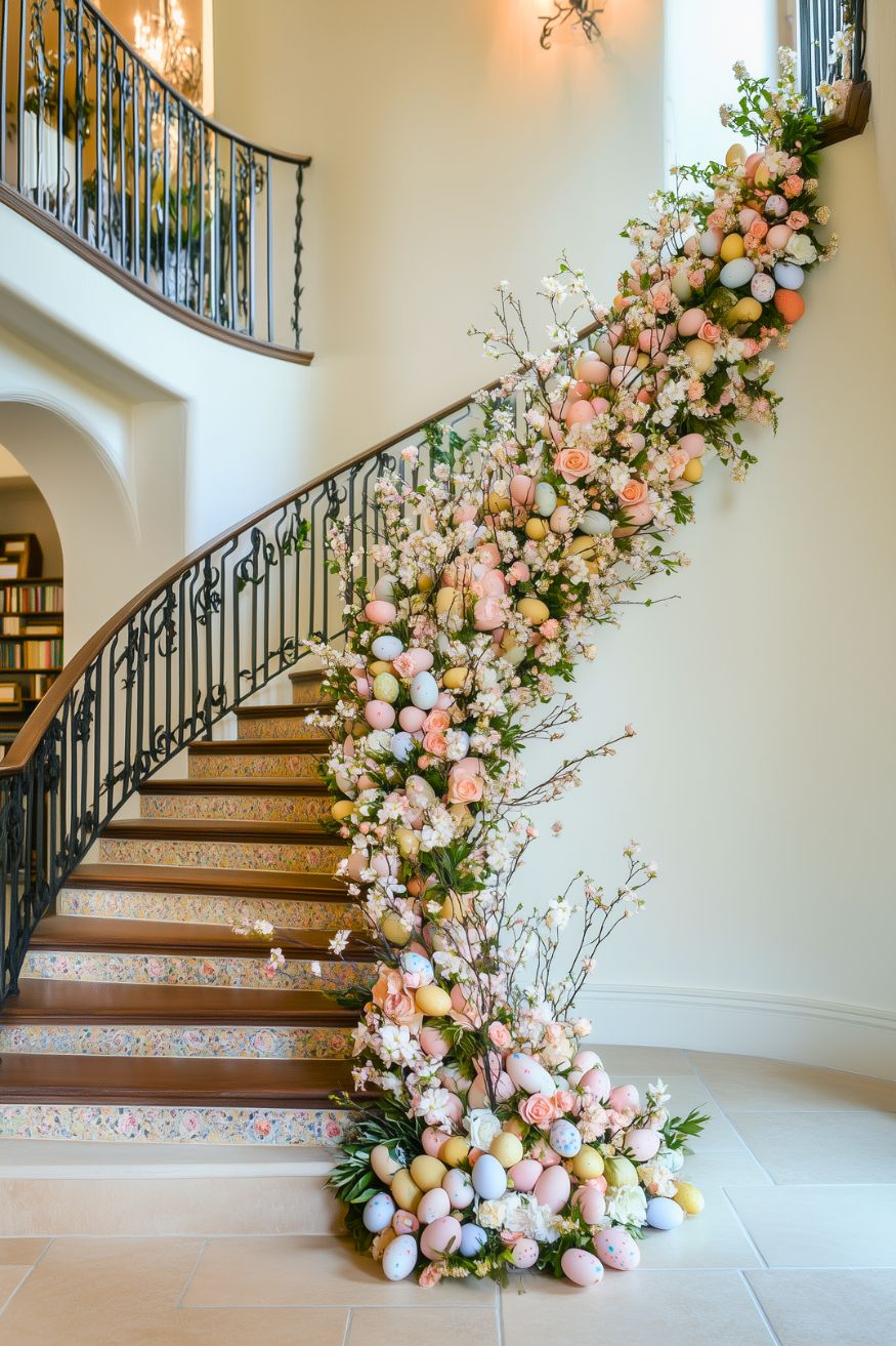 Last but not least, this staircase feels like a full-on spring celebration from the moment you walk in. The pastel eggs tumble together at the base like a little Easter flood, then climb their way up through layers of cherry blossoms and soft roses. Even the stair risers join in with that delicate patterning. It’s dramatic, yes, but in a warm way that makes the house feel festive rather than formal.