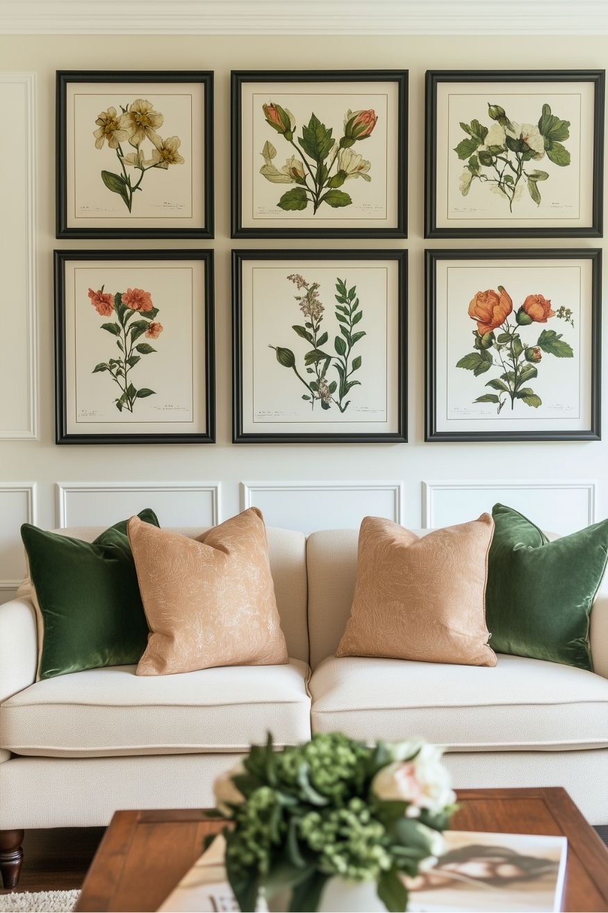 Let’s start with the idea that you can simply recreate at home. You can use any printed pictures that you have to decorate your living room. I’m having the botanical ones here to add more colors and life without overdoing the whole space. Believe me, the grid layout will turn out so calm and balanced.