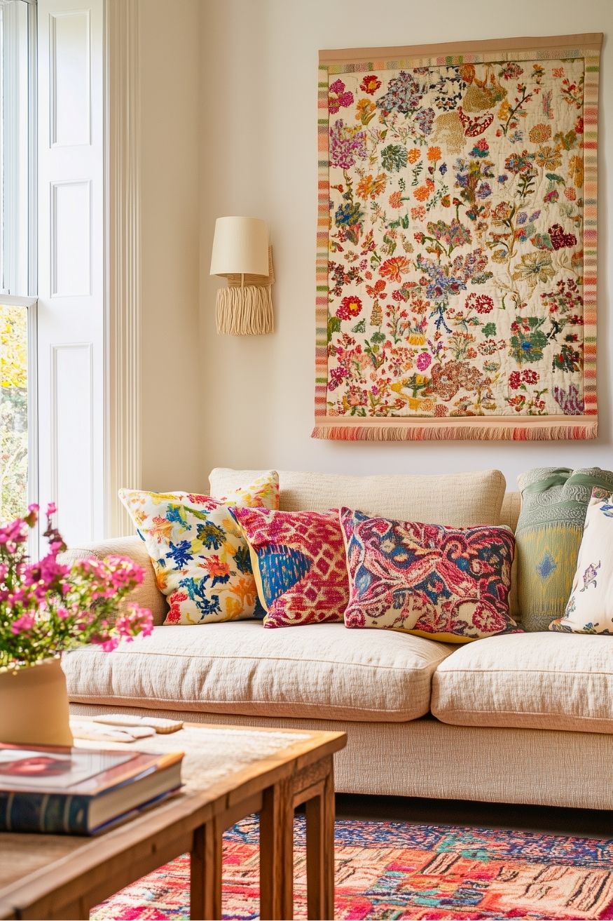 What do you think if we add a little bit of boho into your house this season? The textile artwork adds color, texture, and movement in a way that framed prints can’t. The thing that makes this idea work is that the bold wall piece ties into the patterned pillows and huge rug below. It’s a great one in case you want to lean into something colorful and crafty.