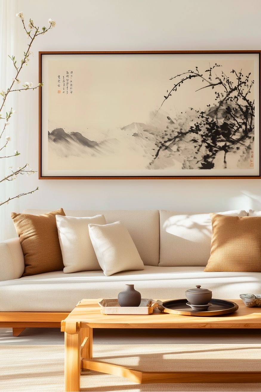 The thing that dragged me here was definitely the oversized Chinese ink wash painting. It makes the wall feel intentional and elevated without being overwhelmed at all. Using the little branch blossoms is such a smart touch.