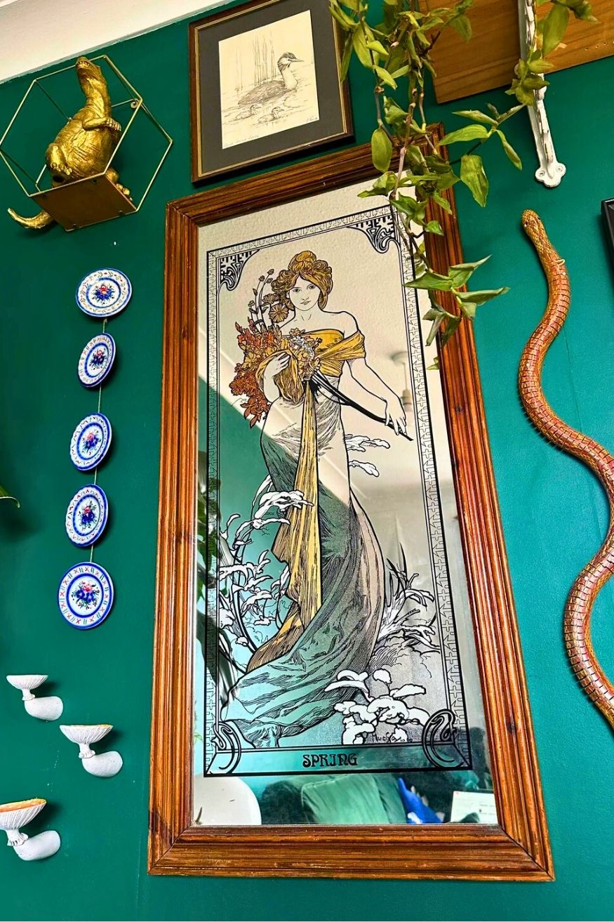 The snake is literally a childhood toy, the Mucha mirror was a boot sale find, and yet it all feels curated. I can say the deep green wall color ties everything together, and maximalism works best in here.