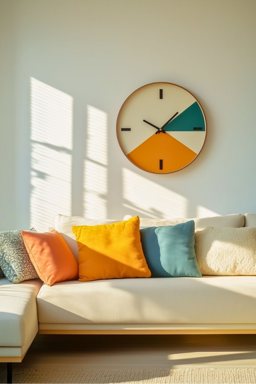 The clock here has the same color palette as the cushions. But again, you can use anything, as long as it matches the furniture to have that aesthetic look.