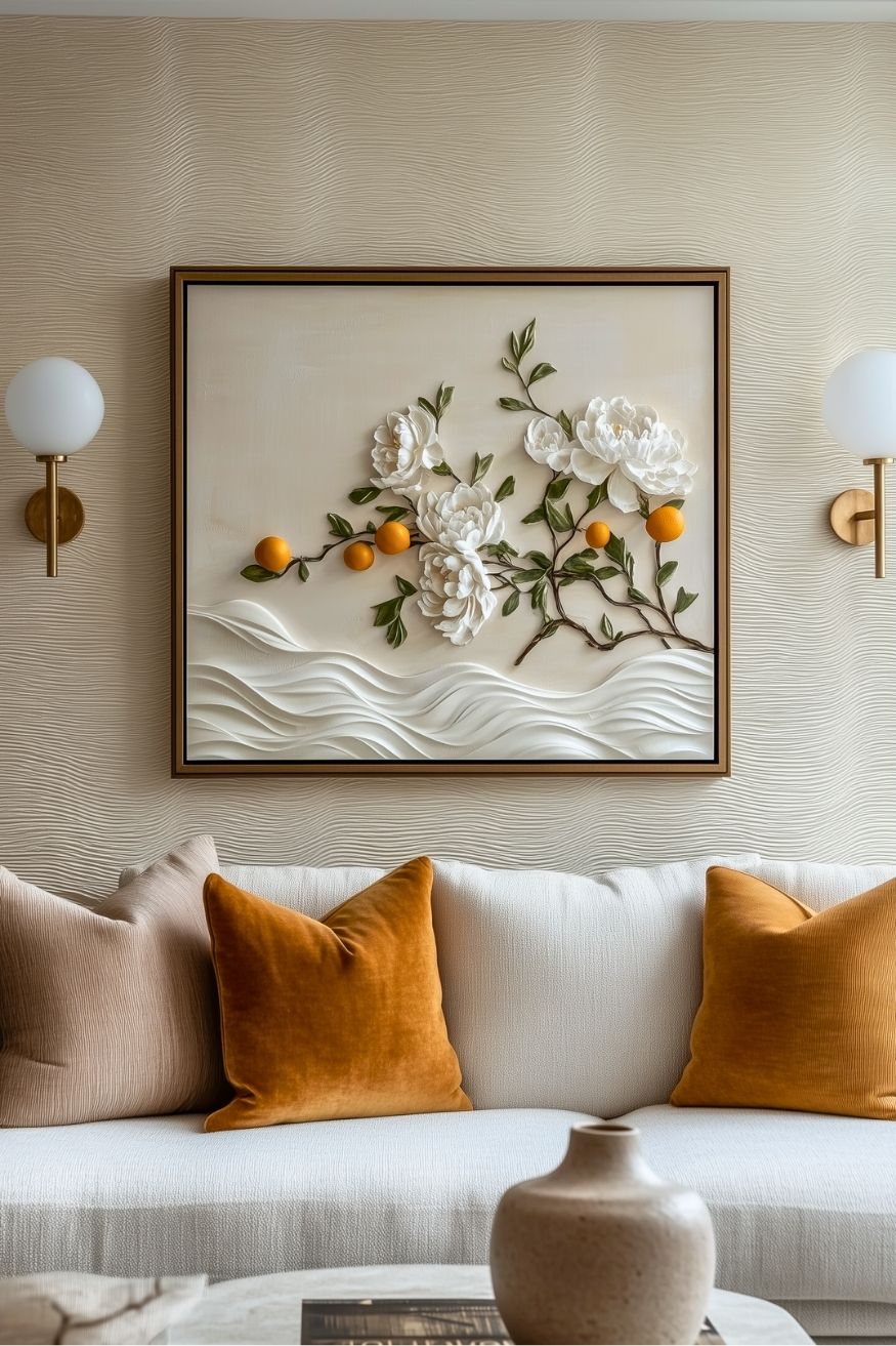 Have you ever thought about the idea of using 3D artwork to decorate your living space? This 3D printing instantly makes the room feel expensive in the best way. The textures themselves add that soft, rippled depth to the wall. But honestly, this one doesn’t fit all rooms.