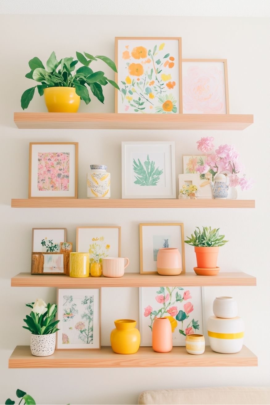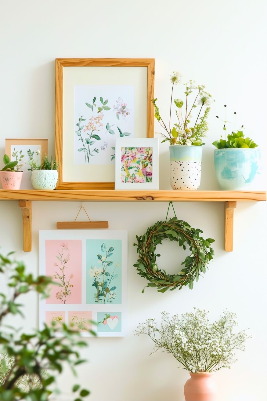 You don’t always need to decorate the entire big wall to create a spring vibe indoors. Focusing solely on decking a shelf is just enough to make the season feel its best. The mix of florals, soft pastels, and fresh greenery keeps the wall lively without looking cluttered. Using a few cheerful pieces, spaced out and balanced, can completely refresh how the room feels.