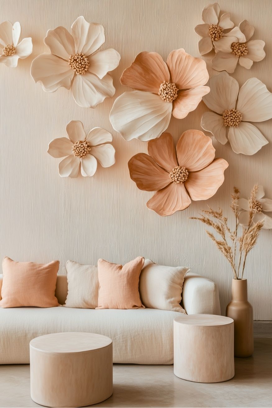 Here’s another oversized 3D floral, but made from paper. They just look like real sculptural art. The mix of creamy white with blushy peach makes everything feel warm and calm instead of overly sweet. And if you want something more personal than just decorative, this handmade one is fine.