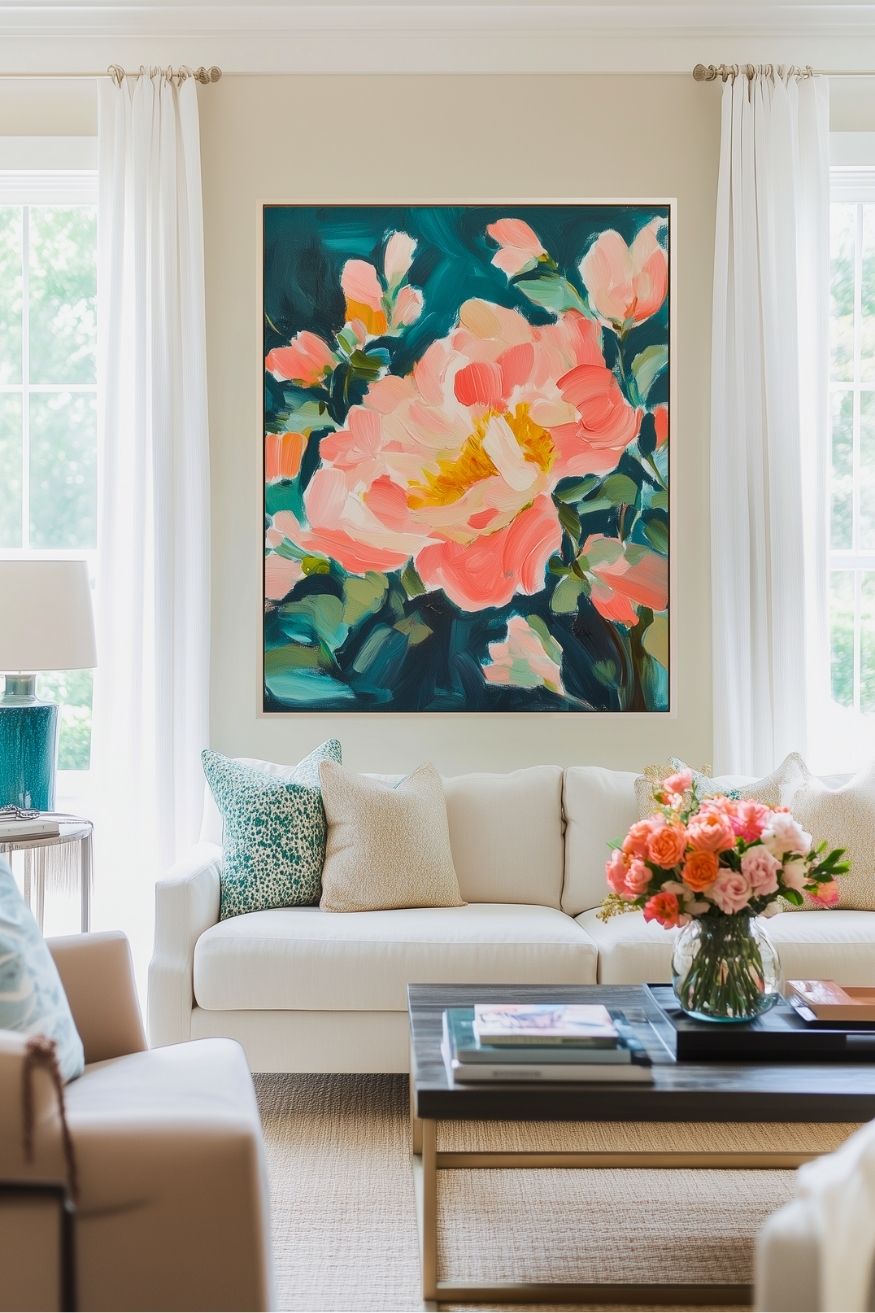 Or you can just place a very big framed picture right in the middle of the room. This is a great example of letting one piece do all the work. The bold floral artwork instantly brings spring into the room while everything else still stays soft and neutral.